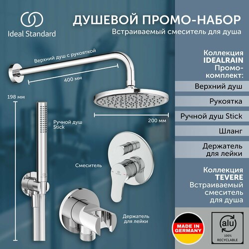 Промо-набор 2 в 1 LG7238AA Ideal Standard состоящий из: Встраиваемый смеситель для ванны/душа, полный комплект (внешняя и встраиваемая части), керамический картридж 47 мм с функцией HWTC (ограничение максимальной температуры горячей воды), металлическая рукоятка с индикаторами горячей / холодной воды, пластиковая накладка; комплект, состоящий из:верхнего душа 200мм, рукоятки 400мм, ручного душа Stick, шланга 1750 мм, держателя для лейки