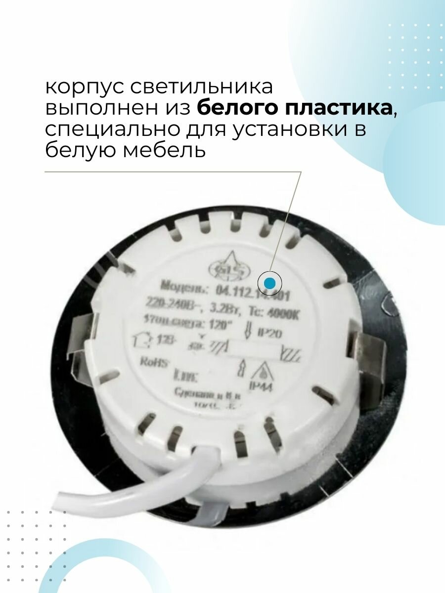 -корпус светильника выполнен из белого пластика, специально для установки в белую мебель,