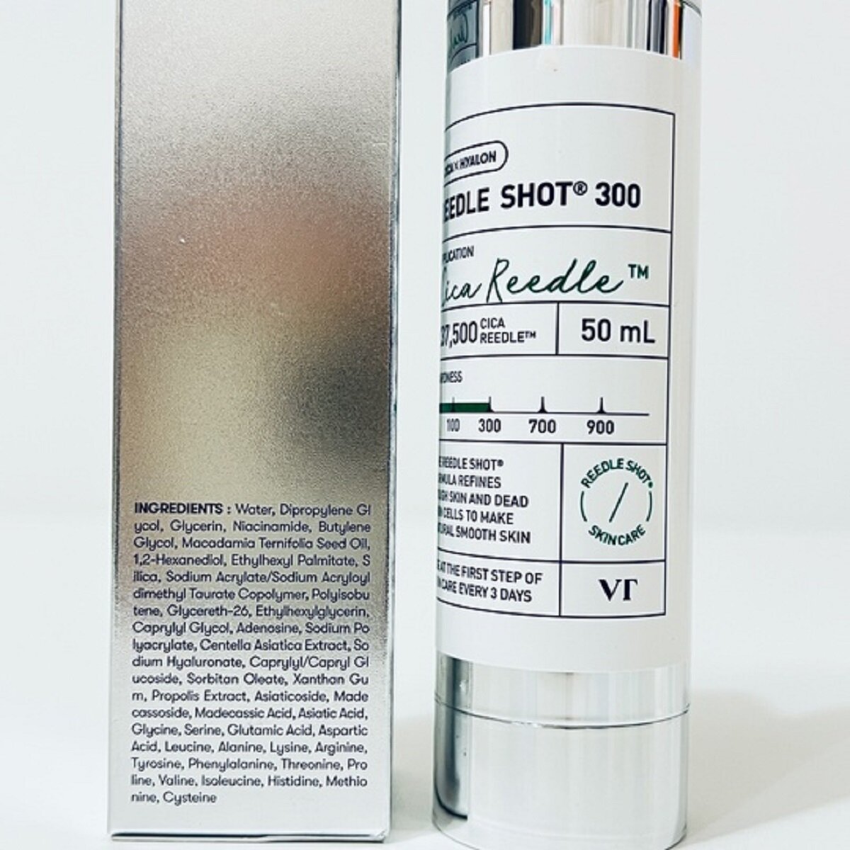 Vt Инновационное средство против морщин (50мл) Cica X Hyalon Reedle Shot 300 - революционный усилитель ухода за кожей, против морщин. Созданная эссенция на основе передовой технологии микроигл и обогащенная экстрактом центеллы азиатской, глубоко проникает в кожу, доставляя мощные активные ингредиенты для заметных результатов. Ингредиенты в виде микроигл меньше пор, что улучшает проникновение и впитывание в кожу. Экстракт центеллы азиатской успокаивает и оживляет кожу, а гиалуроновая кислота обеспечивает интенсивное увлажнение, делая кожу упругой, сияющей и молодой. Клинически доказано, средство улучшает текстуру и эластичность кожи. Это идеальное решение для решения таких проблем кожи, как тусклость, шероховатость и недостаточная эластичность. При регулярном использовании вы можете ожидать более гладкой, упругой и сияющей кожи. Клинические исследования показали, эссенция эффективно улучшает текстуру кожи и гладкость. Пользователи отмечают более гладкую и сияющую кожу уже после нескольких применений, причем с течением времени наблюдается постоянное улучшение. Ингредиенты в форме микроигл глубоко проникают в кожу, стимулируя ее улучшение. Эссенция вызывает ощущение покалывания, которое является естественным и уникальным для продукта, возникает в процессе поглощения питательных веществ. Средство прошло все клинические испытания на раздражение кожи и имеет результаты 0% на кожную реакцию. Эссенция рекомендуется для уставшей, возрастной кожи, нуждающейся в правильном уходе за счет глубокого проникновения активных ингредиентов. Согласно испытаниям и отзывам, в результате использования через три дня кожа становится значительно плотнее, более блестящей и гладкой, эластичной и увлажнённой. Средство быстро впитывается в тусклую кожу, с глубоким всасыванием, что значительно улучшает ее состояние. Люди принимавшие участие в тестировании 100% заявили, что продукт является эффективным и готовы рекомендовать его, и совершить повторную покупку. Линейка REEDLE SHOTсочетает в себе CICA-комплекс и запатентованный ингредиент в форме микроигл для эффективной доставки ингредиентов в самые глубокие слои кожи. Эссенция нагревает очищенные ингредиенты микроигольчатого типа и ингредиенты Cica вместе- в вакууме, в то время как ингредиенты Cica впитываются через мелкие поры и пустые пространства. Ингредиенты Cica Reedle в Reedle Shot меняют цвет на светло-коричневый после очистки, поскольку в них добавлен процесс пропитки экстракта центеллы азиатской, который является запатентованным процессом VT. DEEP, который был доказан клиническими испытаниями, улучшает текстуру кожи за счет увеличения глубины, количества и скорости впитывания. Способ применения: Использовать вечером, на чистое лицо, после тонера нанести необходимое количество средства и аккуратно помассировать подушечками пальцев. Reedle Shot 300 можно использовать 1 раз в три дня. Не рекомендуется тереть, сверху можно нанести крем. Не используйте вместе с аппаратом и после получения косметических процедур прекратите использование при возникновении раздражения. Состав: Азиатикозид - натуральный успокаивающий и регенерирующий компонент, производный от центеллы азиатской. Стимулирует синтез коллагена и эластина. Мадекассосид - производный центеллы, обладает сильными антиоксидантными свойствами. Мадекассова
