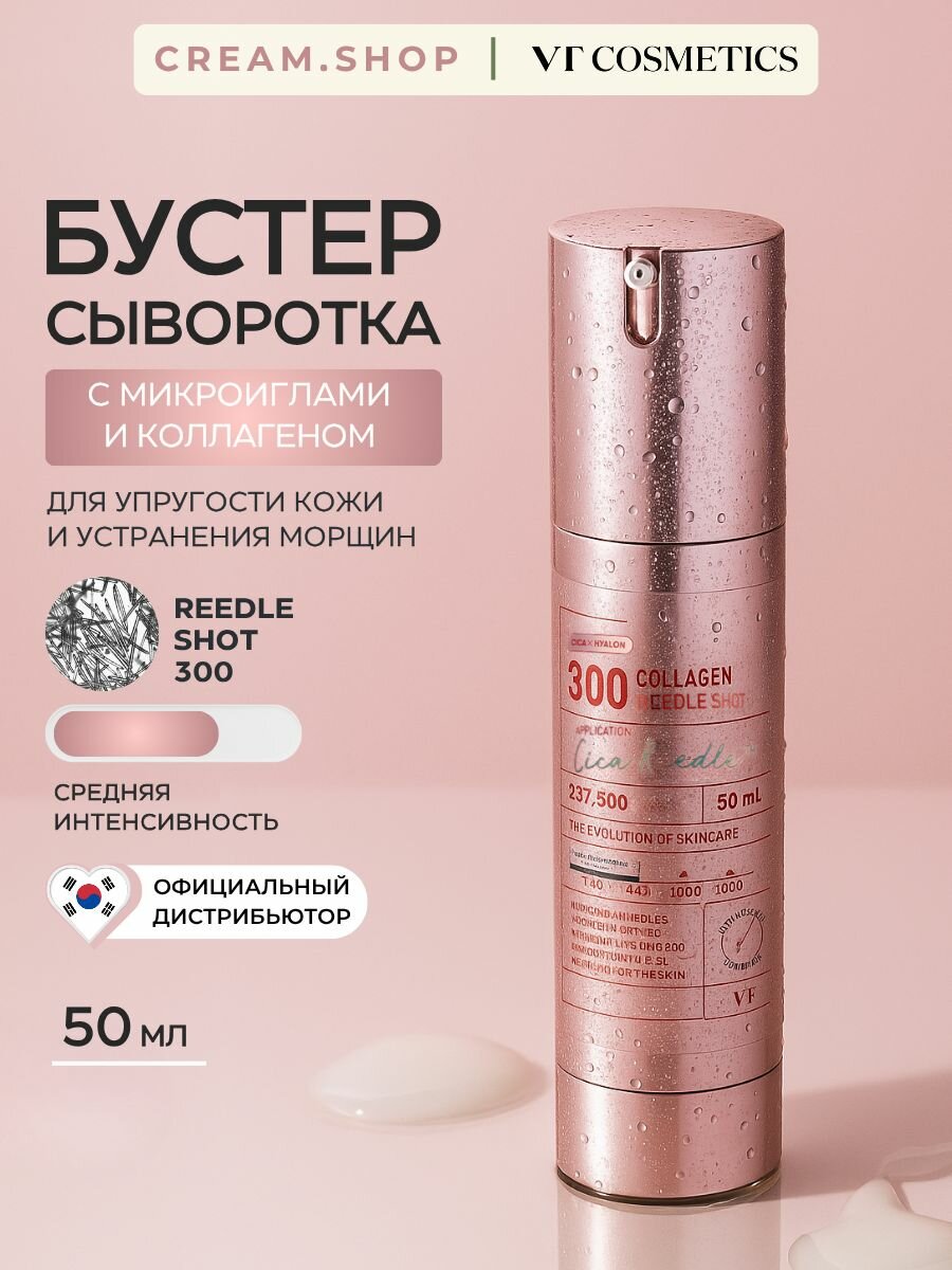 Vt Инновационное средство против морщин с коллагеном (50мл) Collagen Reedle Shot 300 уникальная эссенция с коллагеном которая содержит мощные ингредиенты в форме микроигл, с микро-размером меньше пор. Активные компоненты обладают глубоким проникновением в слои эпидермиса. Средство с коллагеном, способствует повышению эластичности и плотности кожи. Средство имеет 100% степень удовлетворенности количеством впитывания кожи, глубиной впитывания, улучшением скорости впитывания и улучшением текстуры кожи. Увлажняющий состав быстро впитывается, и значительно улучшает текстуру кожи. Эссенция вызывает ощущение покалывания, которое является естественным и уникальным для продукта, возникает в процессе поглощения питательных веществ. Средство прошло все клинические испытания на раздражение кожи и имеет результаты 0% на кожную реакцию. Эссенция рекомендуется для уставшей, возрастной кожи, нуждающейся в правильном уходе за счет глубокого проникновения активных ингредиентов. Согласно испытаниям и отзывам, в результате использования через три дня кожа становится значительно плотнее, более блестящей и гладкой, эластичной и увлажнённой. Средство быстро впитывается в тусклую кожу, с глубоким всасыванием, что значительно улучшает ее состояние. Люди принимавшие участие в тестировании 100% заявили, что продукт является эффективным и готовы рекомендовать его, и совершить повторную покупку. Линейка REEDLE SHOTсочетает в себе CICA-комплекс и запатентованный ингредиент в форме микроигл для эффективной доставки ингредиентов в самые глубокие слои кожи. Эссенция нагревает очищенные ингредиенты микроигольчатого типа и ингредиенты Cica в вакууме, впитываются через мелкие поры и пустые пространства. Состав: Water, Dipropglene G ycol, Niacinamide, Glycerin, Butylene Clycol, Macadamia Ternifolia Seed Oil, 1,2-Hexanediol, Ethylhexy! Palmitate, S odium Polyacrylate, Sodium Acrylate S odium Acryloyidimethyl Taurate Copol ymer, Polyisobutene, Silica, Glycereth-26, Ammonium Acryloyldimethyltaurate VP Copolymer, Ethylhexylglycerin, Glycol, Xanthan Gum, Adenosine, Sodium Hyaluronate, Caprylyl Glucoside, Sorbitan Oleate, Tocopherol, Centella Asiatica Extract, Collagen Wa ter (195.8ppm), Milk Protein Extract, Coll agen Extract(0.4ppm), Madecassoside, Acid, Asiaticoside, Asiatic Продукция VT REEDLE SHOT созданы в Сеуле, в сотрудничестве с дерматологическим центром Oracle. Клиника имеющая около 100 филиалов по всему миру, в число дочерних компаний входят Oracle Skin Clinical Testing Center, научно-исследовательский институт кожи тела человека, компания Oracle Cosmetics-владеющая брендом Dr.Oracle.