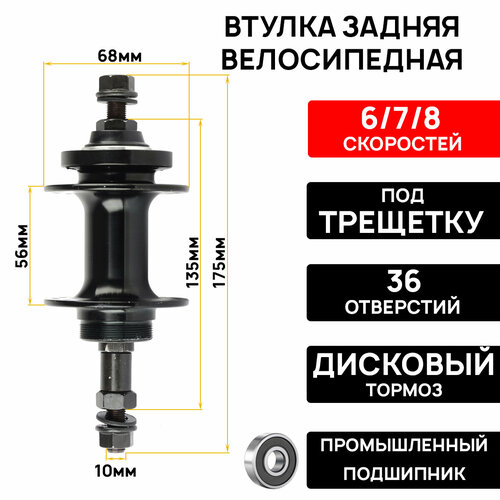 Втулка задняя WZ-A208RB, на 36 спиц, под диск на 6 болтов, под болт, с промышленными подшипниками, под трещотку на 6-8 скоростей, O.L.D. 135 мм, диаметр фланцев по отверстиям для спиц 58 мм, расстояние между фланцами 57 мм, ось 3/8"х145, алюминиевый корпус, чёрная