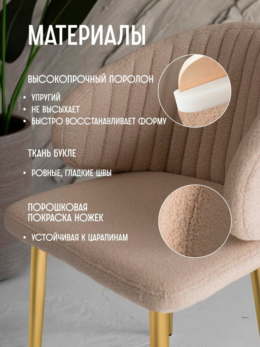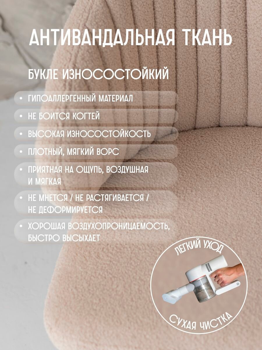Вам не нужно будет бояться за сохранность обивки, ткань с мягкими завитками делает стул роскошным. Букле не только приятна на ощупь, легкая и мягкая, но и обладает высокой износостойкостью. На такой обивке не видно единичных зацепок и их легко убрать самостоятельно. Букле не мнется, не растягивается и не деформируется.