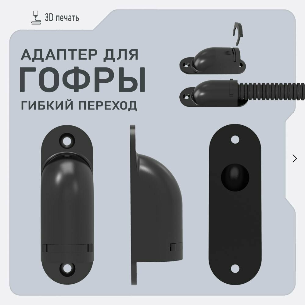 Адаптер для гофры 16мм и фиксатор изготовлены из чёрного PETG пластика при помощи 3D печати.