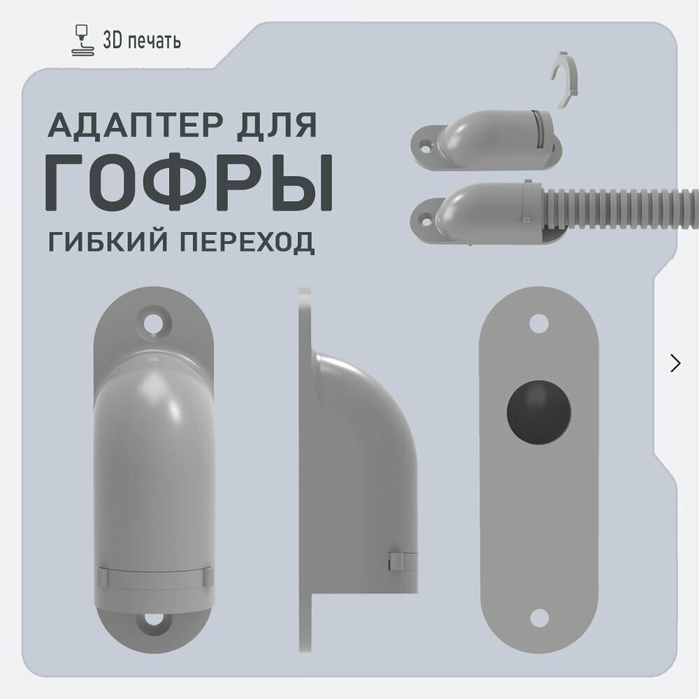Адаптер для гофры 20мм и фиксатор изготовлены из серого PETG пластика при помощи 3D печати.