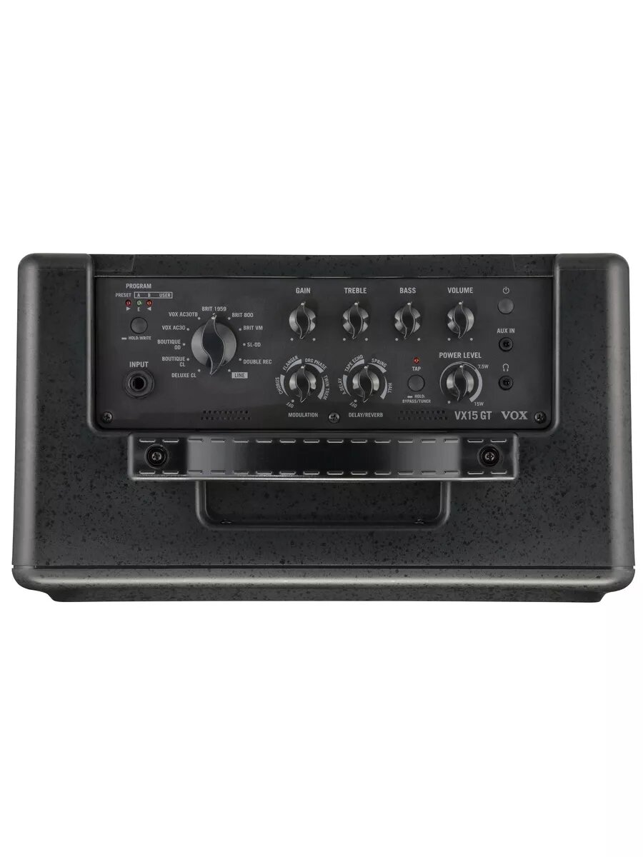 VOX обеспечивает превосходное звучание. Запатентованная технология VET (технология виртуальных элементов) обеспечивает беспрецедентный реализм, воспроизводя не только слышимый результат, но и переосмысливая саму оригинальную схему, кропотливо моделируя даже отдельные компоненты, влияющие на звук. Это устройство воспроизводит множество звуков, включая известные ламповые усилители, современные усилители с высоким усилением и редкие усилители в бутике. Добавлен тип LINE, который поддерживает не только электрогитару, но и акустическую гитару, что еще больше расширяет возможности этого устройства. Включен полный выбор типов эффектов, которые необходимы для формирования вашего звука. Вы можете одновременно использовать оба типа, модуляцию и задержку / реверберацию, и выбирать из четырех типов каждый, что дает вам в общей сложности восемь вариантов. Это означает, что у вас есть возможность добавить последние штрихи, чтобы сформировать общий звук гитары. Также есть кнопка касания, так что вы можете установить такие параметры, как время задержки, интуитивно понятным способом. VX15 GT обладает сверхлегким дизайном, который кажется неразумным для гитарного усилителя, но легкость - не единственное его преимущество. Герметичный корпус из ABS, обладающий превосходными акустическими свойствами, сводит к минимуму ненужную вибрацию, устраняет потерю звука и эффективно воспроизводит звук вашей гитары. Рефлекторная структура обеспечивает хорошее покрытие низкочастотного диапазона. В отличие от случая с обычным маленьким усилителем, вы не почувствуете недостатка мощности. Выход 15 Вт VX15 GT готов к работе где угодно. Вход AUX позволяет вам наслаждаться глушением вместе с внешним аудиоисточником, разъем для наушников / линейный выход со встроенным имитатором кабинета - отличная функция для занятий дома, предустановленный режим позволяет мгновенно вызывать готовые к звучанию звуки, и есть также ручной режим, в котором настройки отражают физические положения ручек.