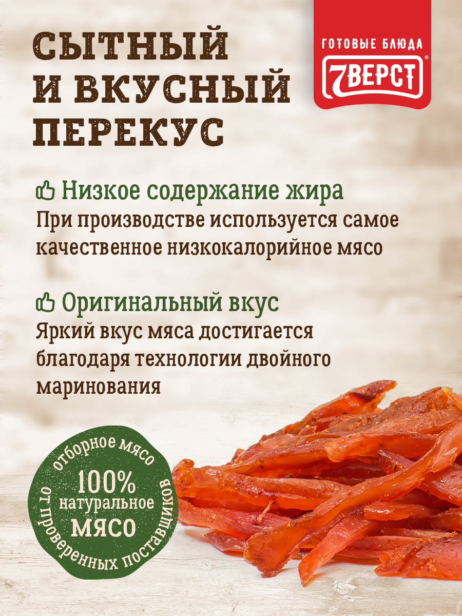 Вяленое мясо 7 Верст представляет собой натуральный продукт, который сочетает в себе традиционные методы приготовления и современные вкусовые предпочтения. Этот вид сушеного мяса отличается особой текстурой и насыщенным вкусом, что делает его отличным выбором для любителей мясных снеков. Благодаря специальной технологии обработки, мясные чипсы сохраняют максимум питательных веществ и при этом обладают легкой жевательной структурой.