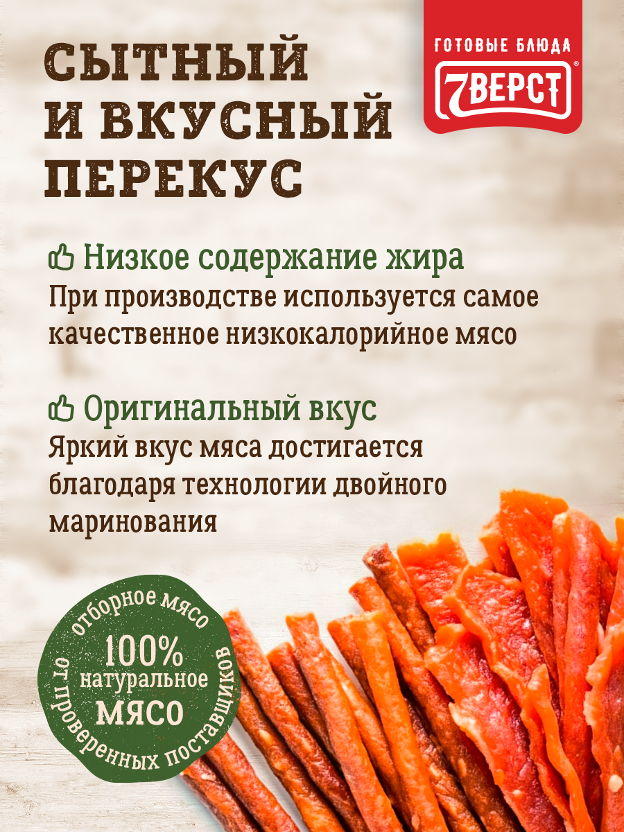 Вяленое мясо 7 Верст представляет собой натуральный продукт, который сочетает в себе традиционные методы приготовления и современные вкусовые предпочтения. Этот вид сушеного мяса отличается особой текстурой и насыщенным вкусом, что делает его отличным выбором для любителей мясных снеков. Благодаря специальной технологии обработки, мясные чипсы сохраняют максимум питательных веществ и при этом обладают легкой жевательной структурой.