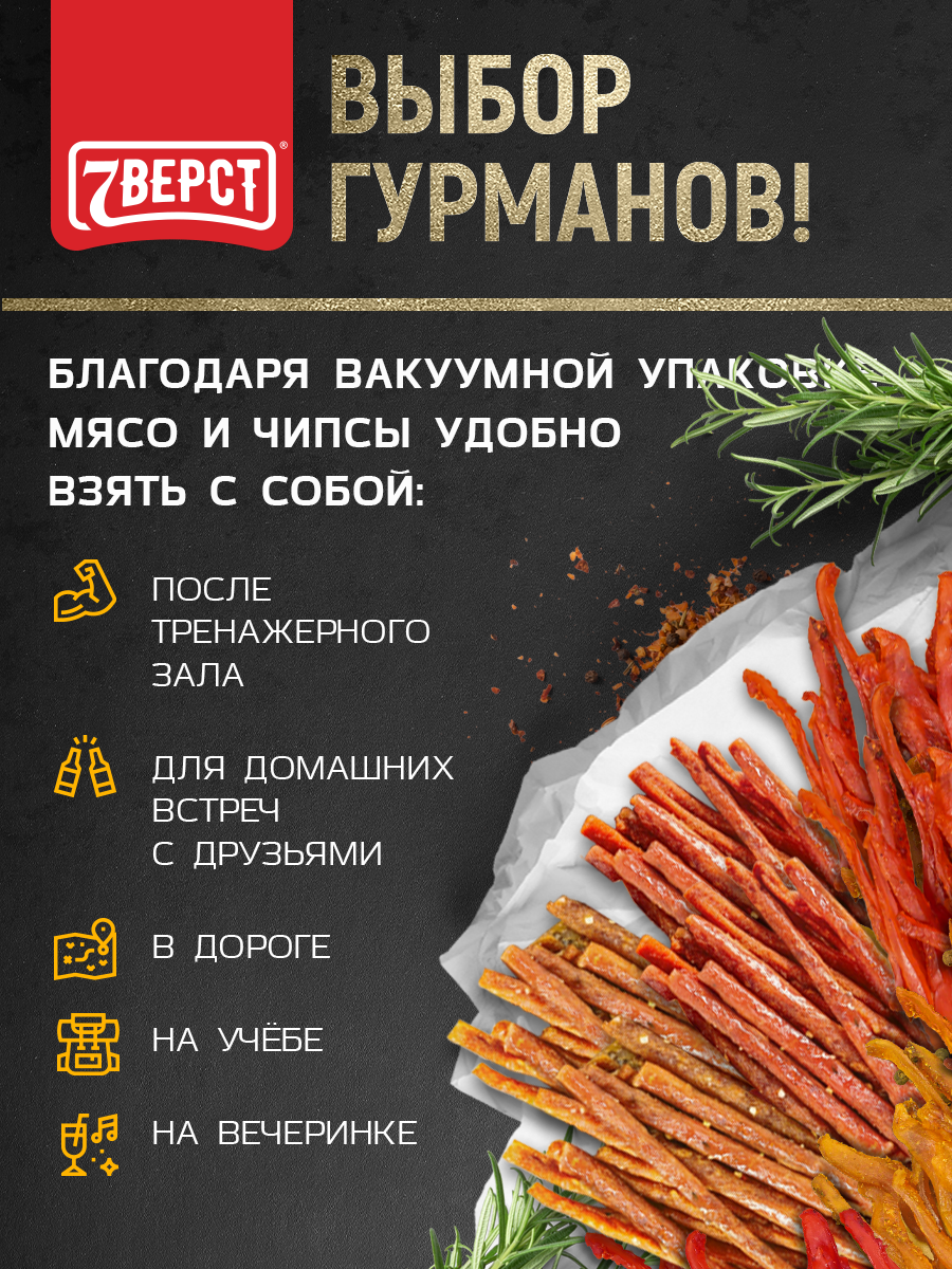 Вяленое мясо 7 Вёрст всегда было популярным выбором среди гурманов. Это вяленое куриное лакомство предлагает уникальное сочетание вкусов и текстур, привлекая ценителей азиатских снеков. Мясные чипсы из курицы – это богатый вкусами перекус, который добавит разнообразие в ваш рацион. Приготовленные по традиционным рецептам сушеное куриное мясо семь вёрст идеально подходит для тех, кто ценит деликатесы. Такой продукт станет замечательным дополнением к любому столу или подарком для близких. Этот набор деликатесов покоряет своим ароматом и неповторимым вкусом. Создавая набор вяленого мяса, сочетали лучшие технологии с надежными ингредиентами. Он включает в себя мясные снеки высокого качества, которые не уступают мировым стандартам. Чипсы мясные 7 верст подойдут как для быстрого перекуса в кругу друзей, так и для самостоятельного наслаждения после долгого дня. Снеки азиатские всегда славились своей пикантностью и оригинальностью исполнения. Их популярность растет с каждым годом благодаря легкости приготовления и отличному вкусу. Они становятся ярким акцентом на любом мероприятии или уютных вечерних посиделках дома. Этот мясной подарочный набор создан специально для того, чтобы удивлять своих близких необычными вкусами и подарить им моменты настоящего гастрономического удовольствия. Ведь мясные деликатесы являются символом изысканности и тонкого вкуса его обладателей. Продукт объединяет в себе все плюсы современной гастрономии: от широкого выбора до глубоких насыщенных ароматов различных специй. Такой презент подходит для всех ценителей качественной кулинарии, кто ищет что-то новенькое и впечатляющее среди привычных блюд. Мясной набор подарочный от бренда 7 Вёрст также является отличным вариантом для быстрого обеда на работе или удачным временным решением на отдыхе на природе. Взяв с собой этот продукт, вы всегда будете готовы предложить гостям что-то особенное вне зависимости от места нахождения. Оно просто создано быть частью вашего дня!