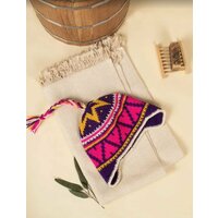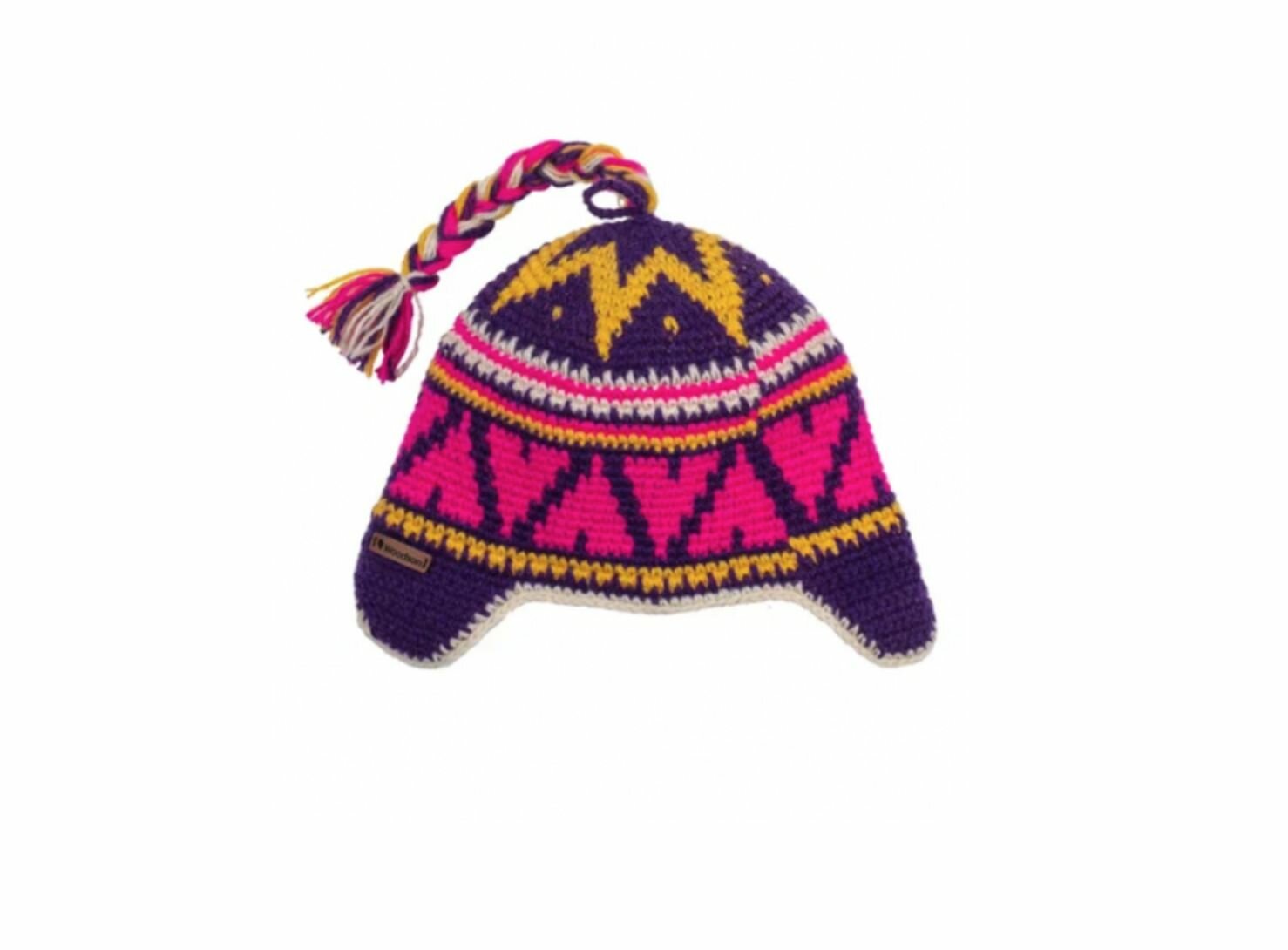 Купить Вязаная шапка унисекс для бани и сауны Woodson Viking Pinky с одной косичкой и ушками, изготовленная из акриловой шерсти, с оригинальным рисунком-орнаментом, фиолетовая / Подарок для мужчин и женщин с доставкой по всей России.