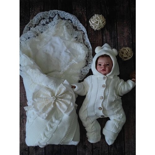 Представляем вам вязаный весенний комплект на выписку, который станет незаменимым спутником в первых месяцах жизни новорожденного малыша. Этот набор, состоящий из 4 прекрасных предметов, предлагает всё необходимое для ребенка и замечательно подходит для температур от +15 до -5 градусов. Что входит в этот волшебный сборник? Во-первых, плед-одеяло размером 100*110 см, которое легко трансформируется в конверт для удобства использования до 6 месяцев. Плед также может быть использован как одеяло в кроватку или укрыватель в коляску во время прогулок. Для создания особого праздничного настроения имеется кружевной пышный уголок и нарядный бант на резинке. Комбинезон вязаный для новорожденного, предназначен для возраста от 0 до 3 месяцев. Он выполнен из мягкой пряжи с добавлением натуральной шерсти (75%) и 25% акрила, что обеспечивает комфорт и приятные ощущения для вашего пупса. Несмотря на наличие шерсти, этот материал не колется и не вызывает раздражения. Комбинезон также оснащен гладкими деревянными пуговицами, безопасными для вашего малыша, а рукава и штанишки могут быть подвёрнуты. Вся одежда сделана с особенным вниманием к деталям и изготовлена из качественных материалов. Акрил в составе пряжи сохраняет внешний вид вещей, предотвращает их скатывание и сминание даже после многократных стирок. Этот стильный демисезонный наборчик подойдет как для мальчиков, так и для девочек, и будет прекрасным подарком для вашего грудничка. Он идеально подходит для выписки из роддома и будет незаменимым вариантом для прогулок на свежем воздухе. В ансамбле с пледом-трансформером праздничный бант, который добавит особый шарм на фотографиях. Теперь ваш ребенок может наслаждаться летними и весенними гуляниями в абсолютном комфорте. Этот гарнитур станет великолепным спутником для поездок и сна в коляске, благодаря своей легкости и удобству использования. Независимо от погоды, ваш ангелочек будет чувствовать себя уютно и защищенно. Предлагаемый набор отлично сочетает в себе практичность, функциональность и модный дизайн. Вязанный конверт на выписку всегда в моде