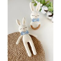 В комплект входят: игрушка зайка, погремушка на буковом кольце