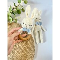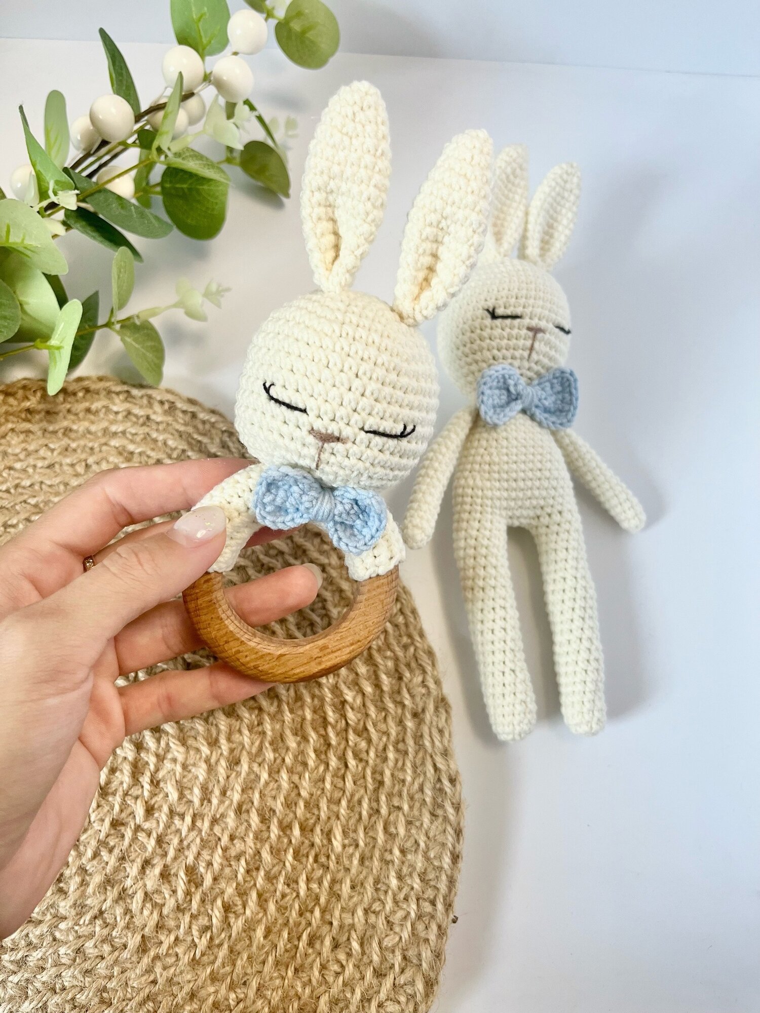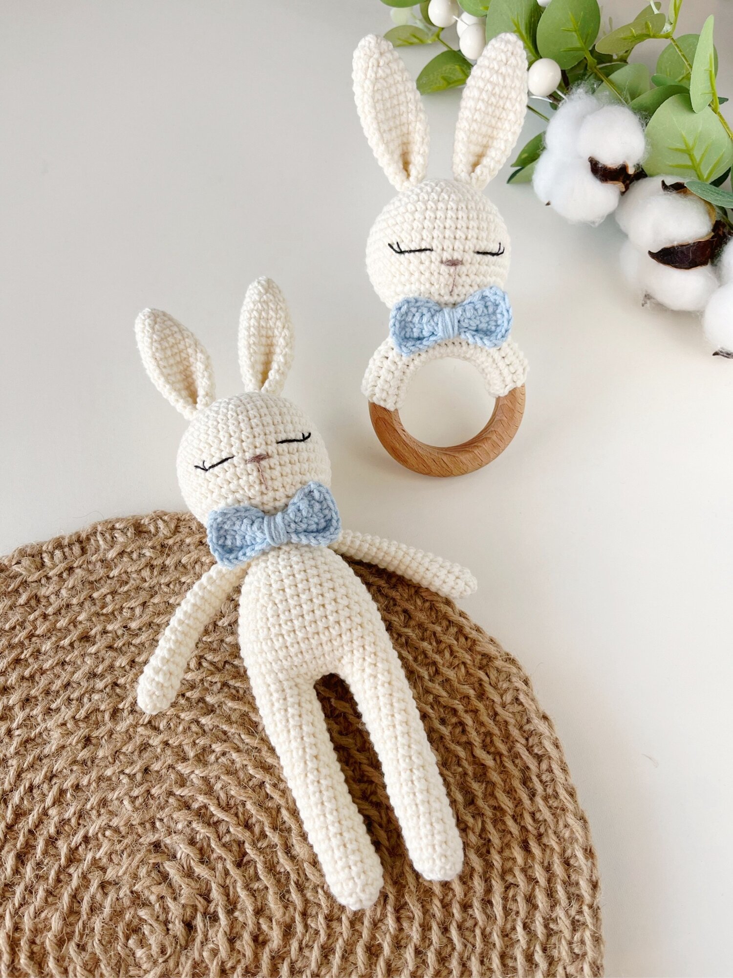 Наполнитель холлофайбер (не сбивается в ком при использовании). Отличный подарок новорожденному мальчику, ребенку на день рождения, внуку, сыну, брату . Подарочный набор деревянных погремушек и вязаных игрушек упакован в крафтовую коробку с бумажным наполнителем. Стильный, современный, экологичный подарок для малыша и его мамы. Состав набора: 1. Детская вязаная погремушка на буковом кольце, Зайчик из 100% натуральных материалов. Экологично, красиво и безопасно. Легкий звон специальных гремелок внутри вязаной погремушки привлечет внимание малыша. Деревянное колечко может служить грызунком для ваших малышей. Погремушка Зайка развивает внимание ребенка и знакомит с животными. Зайка игрушка сплюшка - Эко мягкая игрушка для сна ребенку. Когда ребенок вырастит, у него всегда будет ценная интерьерная вязаная игрушка.
