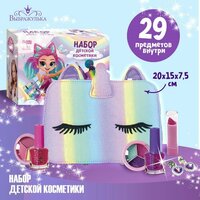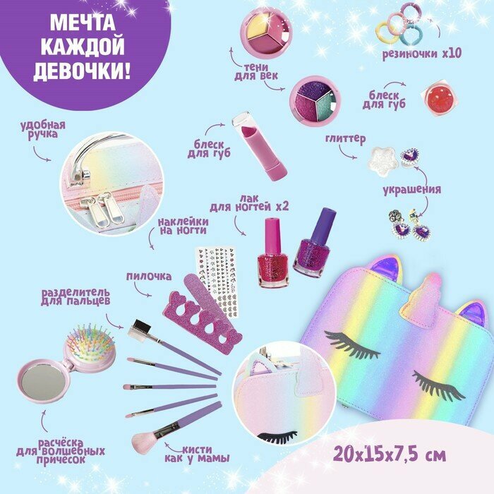 Купить Набор детской косметики в чемодане «Единорожка», тени, резинки для волос, блески для губ, глиттер, украшения, лаки для ногтей, наклейки, пилочка, расчёска, кисти, косметичка с доставкой по всей России.