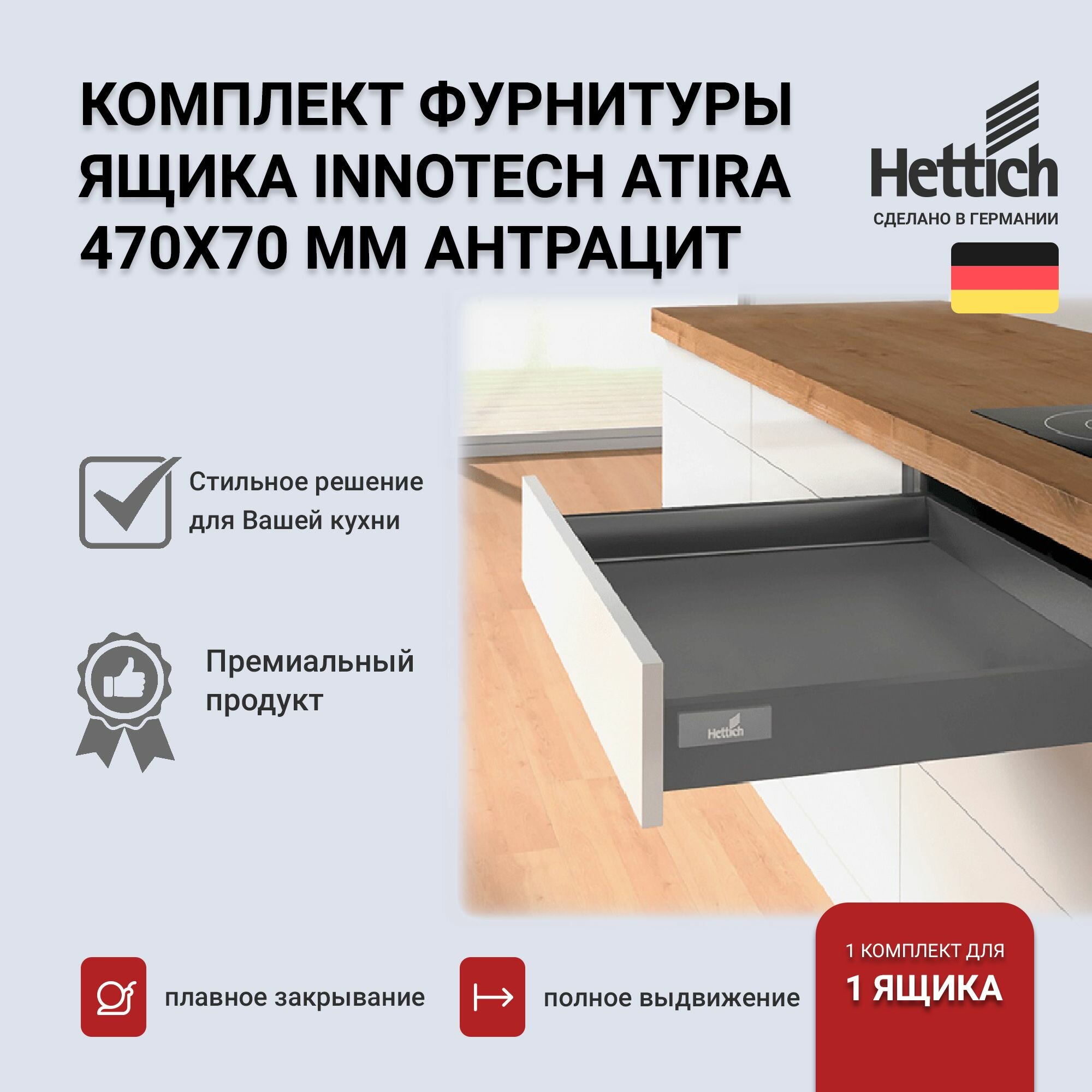 Выдвижной ящик HETTICH InnoTech Atira, антрацит, 470х70, с доводчиком Silent System, 9234545: сравнение цен, характеристики, фото, актуальное наличие и цены.