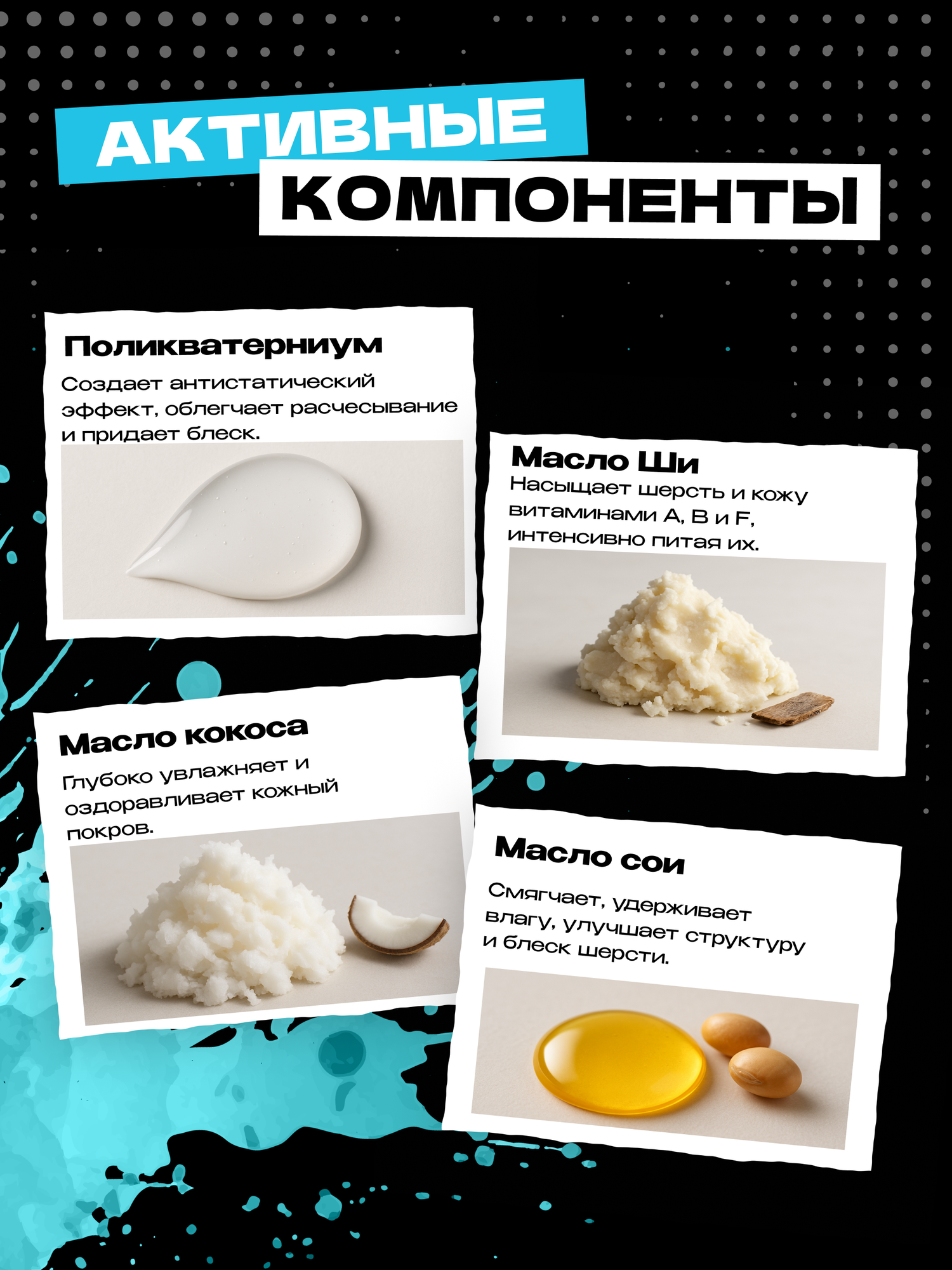 - Кондиционер: Aqua (Water), Propylene Glycol, Cetearyl Alcohol, Butyrospermum Parkii (Shea Butter), Cocos Nucifera (Coconut) Butter, Glycerin, Cetrimonium Chloride, Cyclopentasiloxane, Bis-Hydroxy/Methoxy Amodimethicone, Parfum (Fragrance), Tocopheryl Acetate, Glycine Soja (Soybean) Oil, Methylchloroisothiazolinone, Methylisothiazolinone.