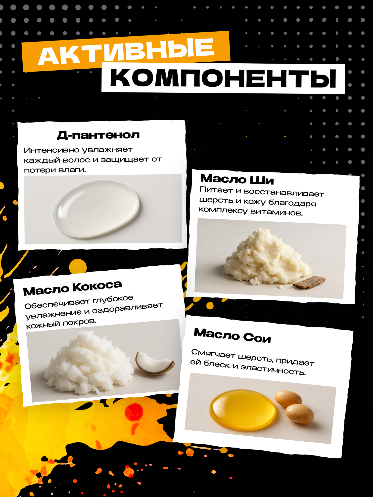 Масло Ши (в обоих продуктах): насыщает кожу и шерсть витаминами A, B и F, обеспечивая интенсивное питание и восстановление.