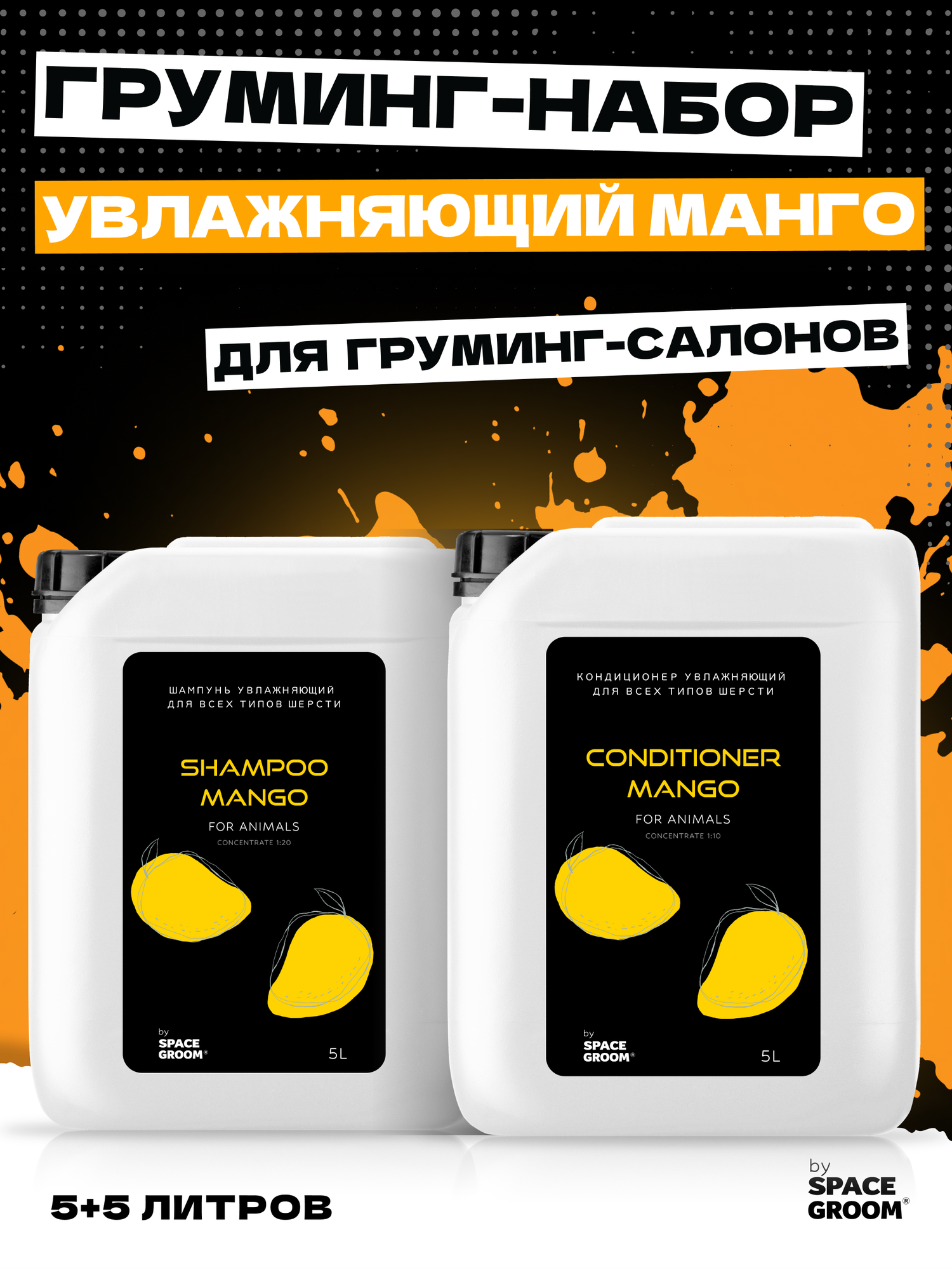 Выгодный увлажняющий набор Space Groom – это профессиональная двухэтапная система ухода с единым ароматом манго, созданная для глубокого насыщения шерсти влагой. Комплект включает два высококонцентрированных средства объемом по 5 литров: увлажняющий шампунь и кондиционер. Продукты разработаны для совместного применения, чтобы обеспечить максимальный эффект: шампунь бережно очищает и подготавливает шерсть, а кондиционер запечатывает влагу внутри волоса, придавая ему эластичность, объем и блеск. Свежий тропический аромат манго превращает купание в приятную процедуру.