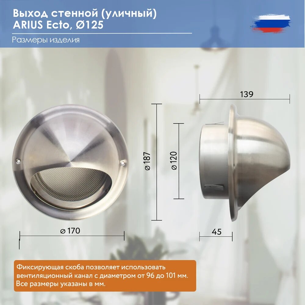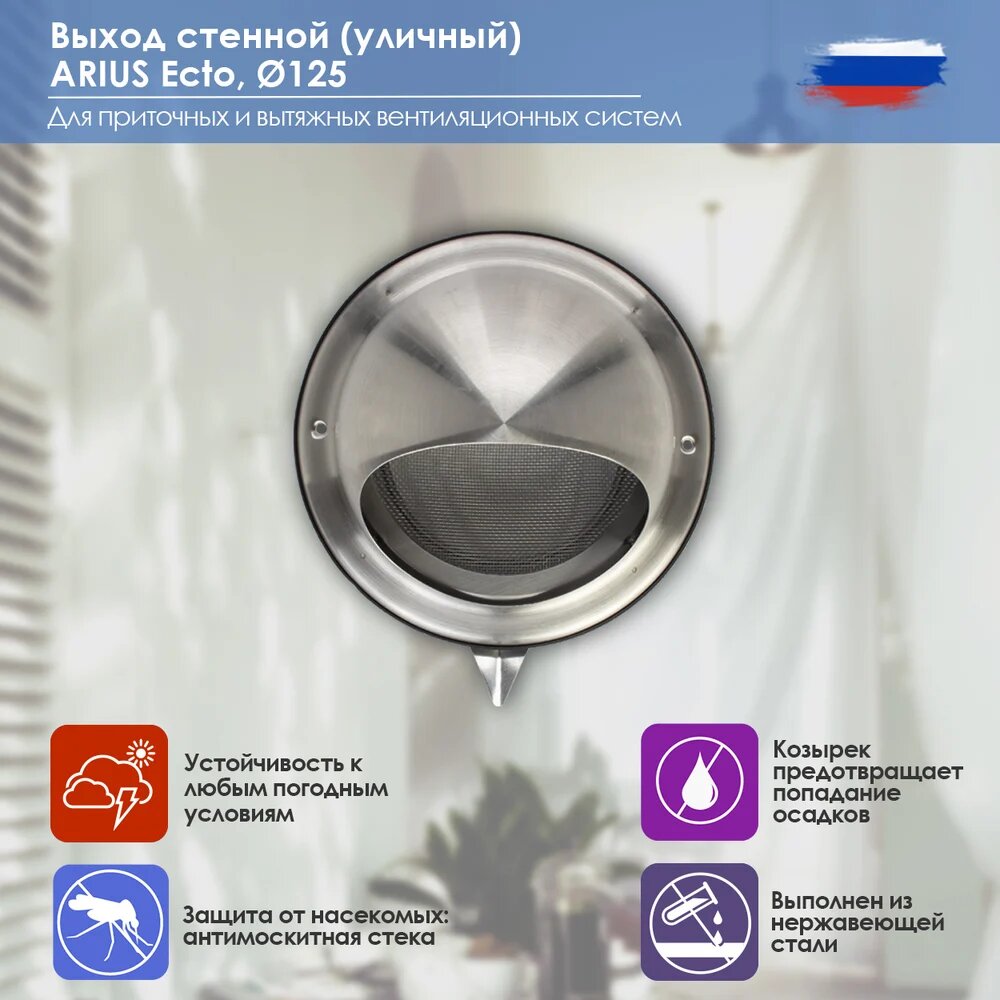 Купить Выход стенной (уличный) из нержавеющей стали, решетка с козырьком, круглый, 125 мм, с антимоскитной защитной стальной сеткой Ecto-125 ARIUS 134729 с доставкой по всей России. Выход стенной (уличный) из нержавеющей стали, решетка с козырьком, круглый, 125 мм, с антимоскитной защитной стальной сеткой Ecto-125 ARIUS 134729: сравнение цен, характеристики, фото, актуальное наличие и цены.
