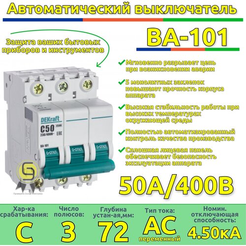 Купить Выключатель автоматический трехполюсный 50А С ВА-101 4.5кА DEKraft (комплект 4шт) с доставкой по всей России. Выключатель автоматический трехполюсный 50А С ВА-101 4.5кА DEKraft (комплект 4шт): сравнение цен, характеристики, фото, актуальное наличие и цены.