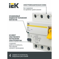 Электромеханическая схема без электронных компонентов. Наиболее надежная защита человека при прямом прикосновении к токоведущим частям. Независимый индикатор положения контактов. Широкий диапазон рабочих температур от -25°С до +50°С. Не имеет собственного потребления электроэнергии и сохраняет работоспособность при обрыве нулевого проводника. Насечки на контактных зажимах снижают тепловые потери и увеличивают механическую устойчивость соединения. Наличие кнопки ТЕСТ для проверки работоспособности устройства и правильности подключения. Быстрый монтаж с помощью защелки с двойным фиксированным положением. Условный ток короткого замыкания 4,5кА.