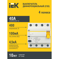 Купить Выключатель дифф. тока УЗО IEK ВД1-63 (MDV10-4-040-100) 40A 100мА AC 4П 400В 4мод белый (упак:1шт) с доставкой по всей России. Выключатель дифф. тока УЗО IEK ВД1-63 (MDV10-4-040-100) 40A 100мА AC 4П 400В 4мод белый (упак:1шт): сравнение цен, характеристики, фото, актуальное наличие и цены.