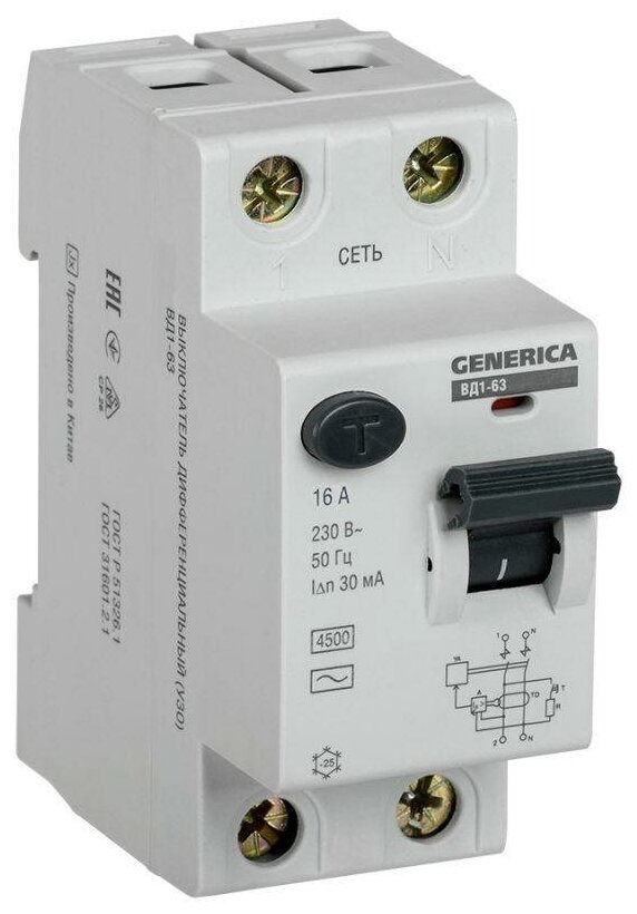 Выключатель дифференциального тока (УЗО) 2п 16А 30мА тип AC ВД1-63 GENERICA MDV15-2-016-030: сравнение цен, характеристики, фото, актуальное наличие и цены.