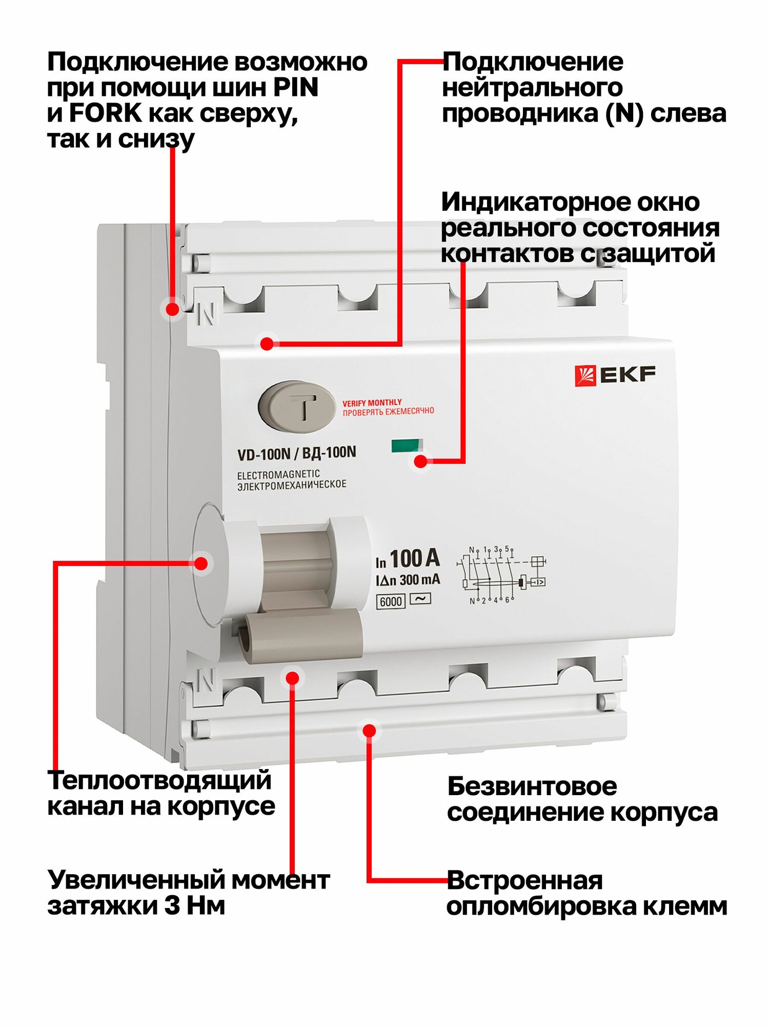 Преимущества УЗО EKF PROXIMA ВД-100N не ограничиваются его функциональностью. Дизайн продукта учитывает не только эстетические, но и практические аспекты. Теплоотводящий канал на корпусе эффективно рассеивает тепло, продлевая срок службы устройства. Индикаторное окно позволяет легко и быстро проверить реальное состояние контактов. Для удобства монтажа предусмотрено подключение шин PIN и FORK как сверху, так и снизу, а также соединение нейтрального проводника (N) слева. Встроенная опломбировка клемм, усиленные клеммы и винты, а также увеличенный момент затяжки в 3 Нм обеспечивают надежность соединений и защиту от несанкционированного доступа. Медные токоведущие части и большие контактные напайки гарантируют отличную проводимость и долговечность.