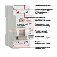 Технические характеристики данного устройства защитного отключения включают номинальный ток в 40А и ток утечки в 100мА, что соответствует типу AC. УЗО двухполюсное (2P) и способно выдерживать короткое замыкание до 6кА. Компоненты устройства изготовлены из высококачественной меди, что обеспечивает отличную проводимость и надежность. Диапазон рабочих температур устройства составляет от -40 до +55°С, что гарантирует его функциональность в самых различных климатических условиях.