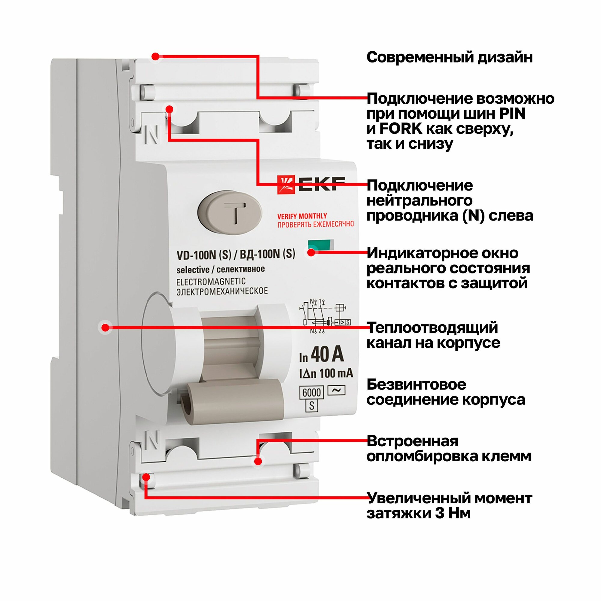 Уникальные преимущества УЗО EKF PROXIMA ВД-100N (S) делают его выдающимся продуктом на рынке устройств защитного отключения. Оно обладает теплоотводящим каналом на корпусе, что значительно улучшает его тепловые характеристики и продлевает срок службы. Индикаторное окно реального состояния контактов с защитой позволяет оперативно и точно оценить состояние устройства. Также УЗО имеет более современный дизайн и встроенную опломбировку клемм, что повышает безопасность его использования и предотвращает несанкционированный доступ к клеммам. Увеличенный момент затяжки 3 Нм обеспечивает более надежное соединение, а безвинтовое соединение корпуса упрощает монтаж и обслуживание. Подключение возможно при помощи шин PIN и FORK как сверху, так и снизу, что предоставляет большую гибкость при установке. Устройство соответствует международным стандартам ГОСТ 31601.2.1 (IEC 61008–2–1), IEC 61008–1 и сертифицировано по RoHS, EAC, CE, что подтверждает его высокое качество и безопасность использования.