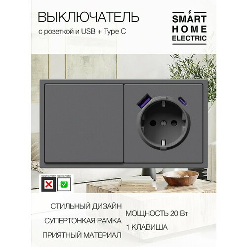 Одноклавишный механический выключатель с розеткой серого цвета. Надежный и недорогой выключатель в современном дизайне. Это готовый комплект для установки, докупать ничего не нужно. Устанавливается в двойной стандартный круглый подрозетник. – Стильная тонкая рамка шириной 4мм отлично впишется в любой интерьер. Размеры 150 на 80 мм. Выпирает от стены всего на 10 мм. Матовое soft-touch покрытие, которого хочется касаться. – Блок электрической розетки с USB зарядкой. Универсальная розетка на 16А с дополнительными разъемами USB для зарядки телефонов. Два разъема для зарядки гаджетов: Популярный USB-A и современный USB-C, подойдет любой провод. Мощность зарядки 20Вт. Зарядит Iphone 15 с 0 до 100 % примерно за 1 час. Поддерживает протоколы быстрой зарядки. – Блок механического выключателя . Большие и удобные клавиши отлично выглядят и имеют мягкий механизм переключения. Все остальные розетки и выключатели есть в наличии в нашем магазине