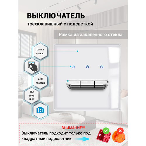 Купить Выключатель трехклавишный с подсветкой, рамка стекло Белый с доставкой по всей России. Выключатель трехклавишный с подсветкой, рамка стекло Белый: сравнение цен, характеристики, фото, актуальное наличие и цены.