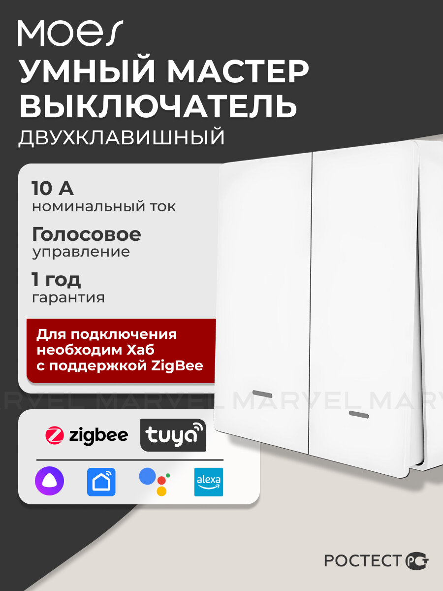 Выключатель умный двухклавишный Zigbee Moes ZS-B-EU2-WH-MS, встраиваемый, белый: сравнение цен, характеристики, фото, актуальное наличие и цены.