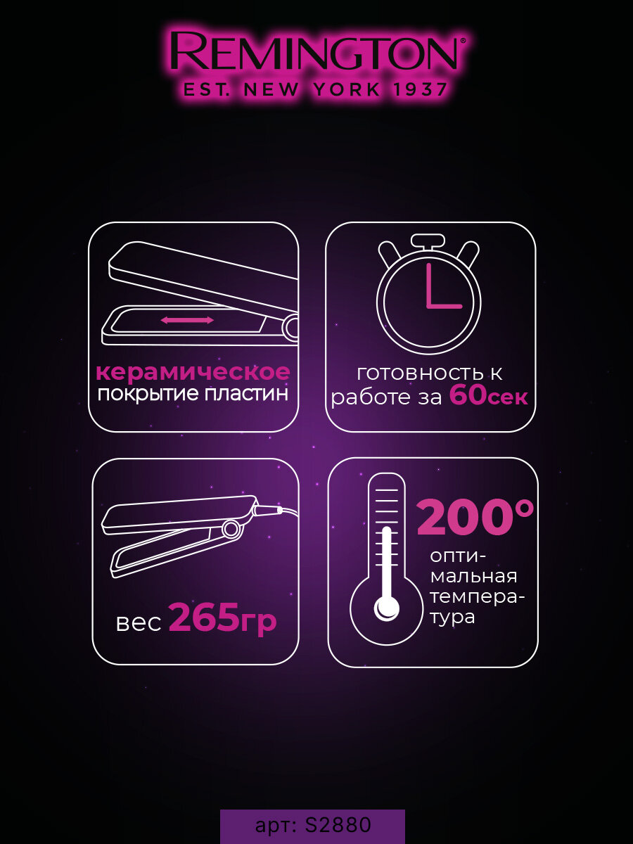 Выпрямитель для волос Remington S2880, керамика, Длина 15 см, 200 Градусов, нагрев 60 сек: сравнение цен, характеристики, фото, актуальное наличие и цены.