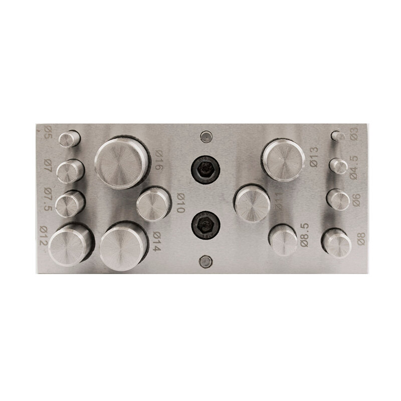 Вырубка дисков ювелирная применяется для вырубки дисков из мягких цветных металлов, таких как золото, серебро, медь, латунь и др. Максимальная толщина материала для вырубки - до 0,8 мм (для золота, серебра) Вырубка изготовлена из стали. Характеристики: Размер платформы 110х47х25 мм Вырубка имеет 14 размеров отверстий от 3 до 16 мм. (3 / 4,5 / 5 / 6 / 7 / 7,5 / 8 / 8,5 / 10 / 11 / 12 / 13 / 14 / 16 мм.) Внимание! Данная модель вырубки НЕ предназначена для твердых металлов.