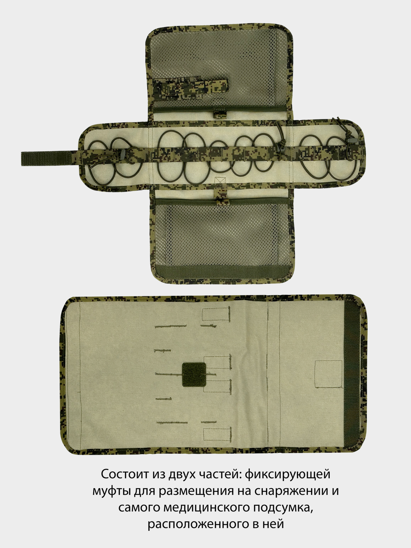 Особенности: Надежная фиксация на эластичных плетеных шнурах. Предназначен для ношения на боевом поясе. Подсумок для аптечки второго эшелона. Комплект из фиксирующей муфты и медицинского подсумка. Доступ к содержимому с левой или правой стороны. Подходит для отечественной и иностранной медицины. Современные износостойкие материалы.