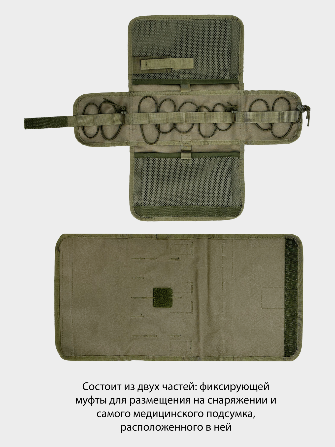 Особенности: Надежная фиксация на эластичных плетеных шнурах. Предназначен для ношения на боевом поясе. Подсумок для аптечки второго эшелона. Комплект из фиксирующей муфты и медицинского подсумка. Доступ к содержимому с левой или правой стороны. Подходит для отечественной и иностранной медицины. Современные износостойкие материалы.