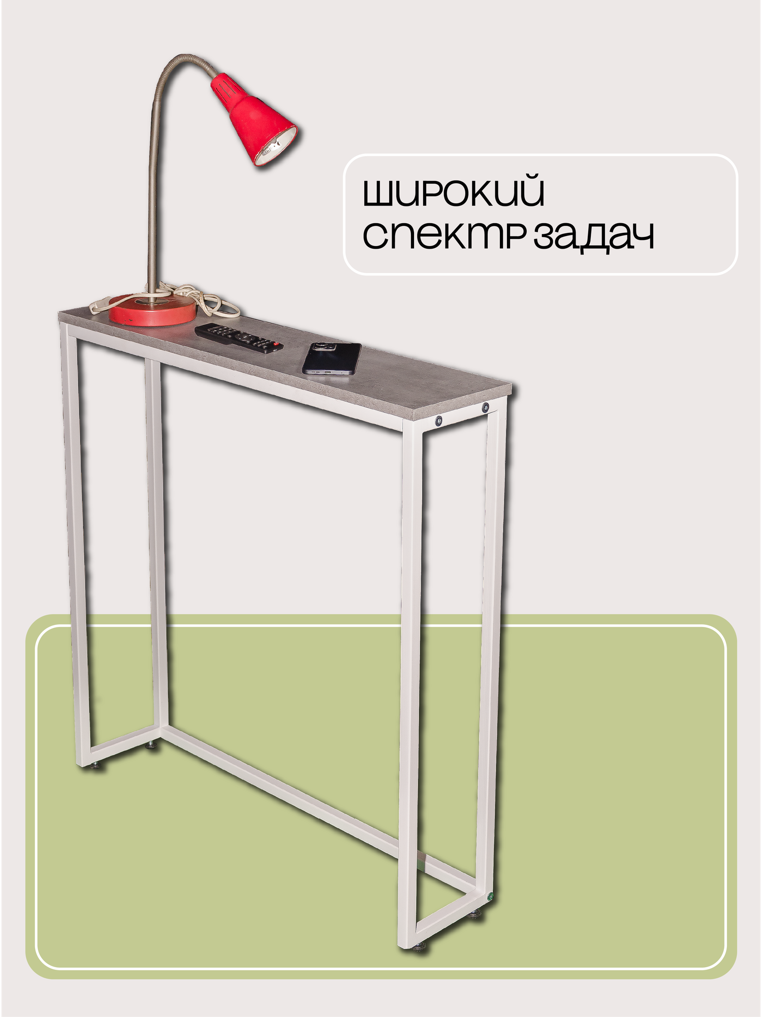 Консольный столик с разборным каркасом размерами 80х20х80 см. Сварен из квадратной трубы 20х20мм, окрашен долговечной полимерно-порошковой краской. Столешница ЛДСП 16 мм серый бетон. Быстрая сборка за 5 минут. На ножках есть регулируемые опоры.