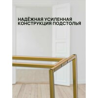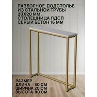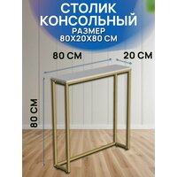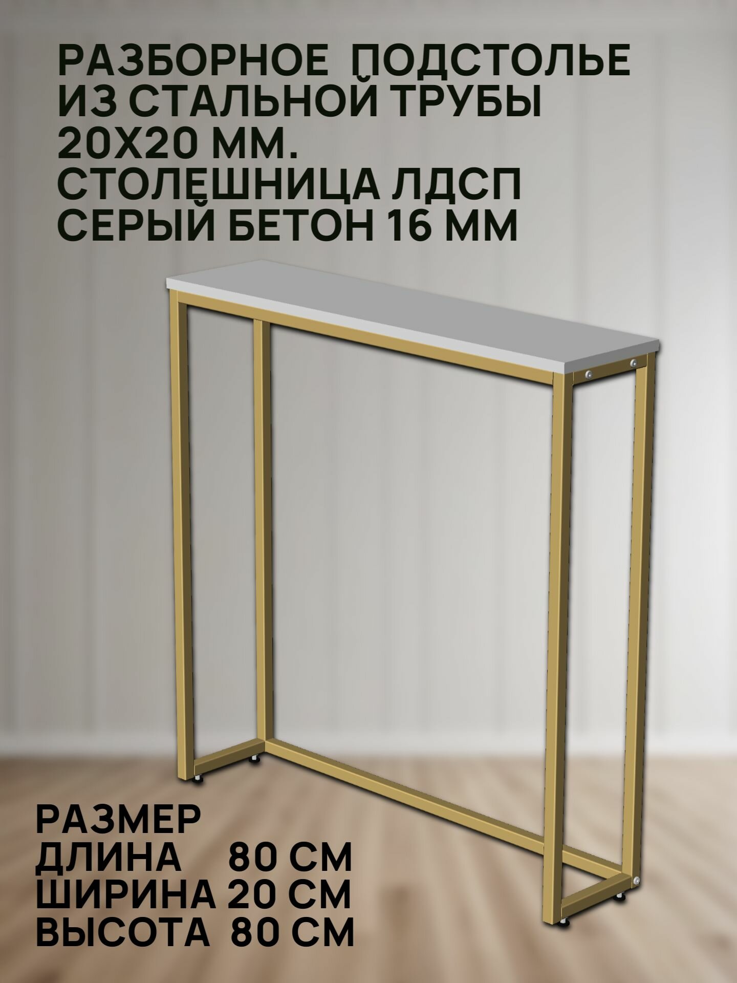 Консольный столик с разборным каркасом размерами 80х20х80 см. Сварен из квадратной трубы 20х20мм, окрашен долговечной полимерно-порошковой краской в цвет матовое золото. Столешница ЛДСП 16 мм белого цвета.