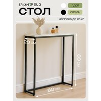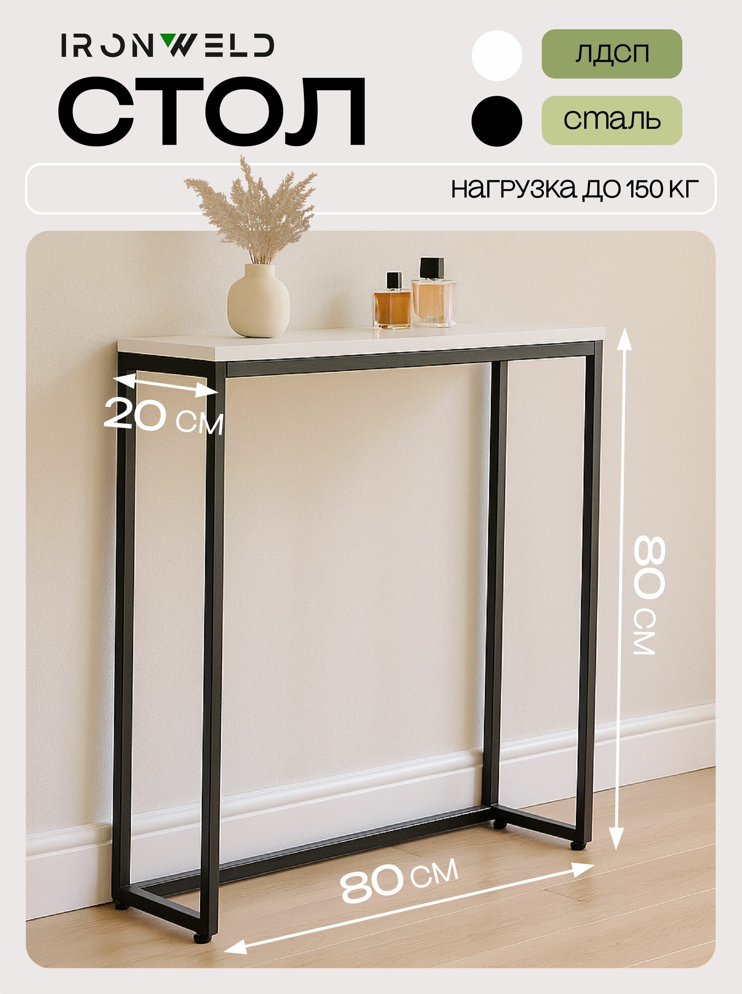 Консольный столик с разборным каркасом размерами 80х20х80 см. Сварен из квадратной трубы 20х20мм, окрашен долговечной полимерно-порошковой краской. Столешница ЛДСП 16мм белого цвета. Высота регулируется 80-81 см за счёт пластиковых регулируемых подпятников.