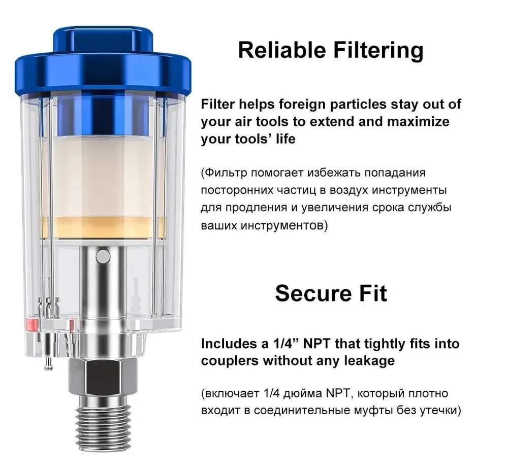 F. Сетчатый фильтр удаляет частицы грязи из краски и предотвращает появление дефектов.
