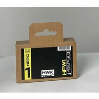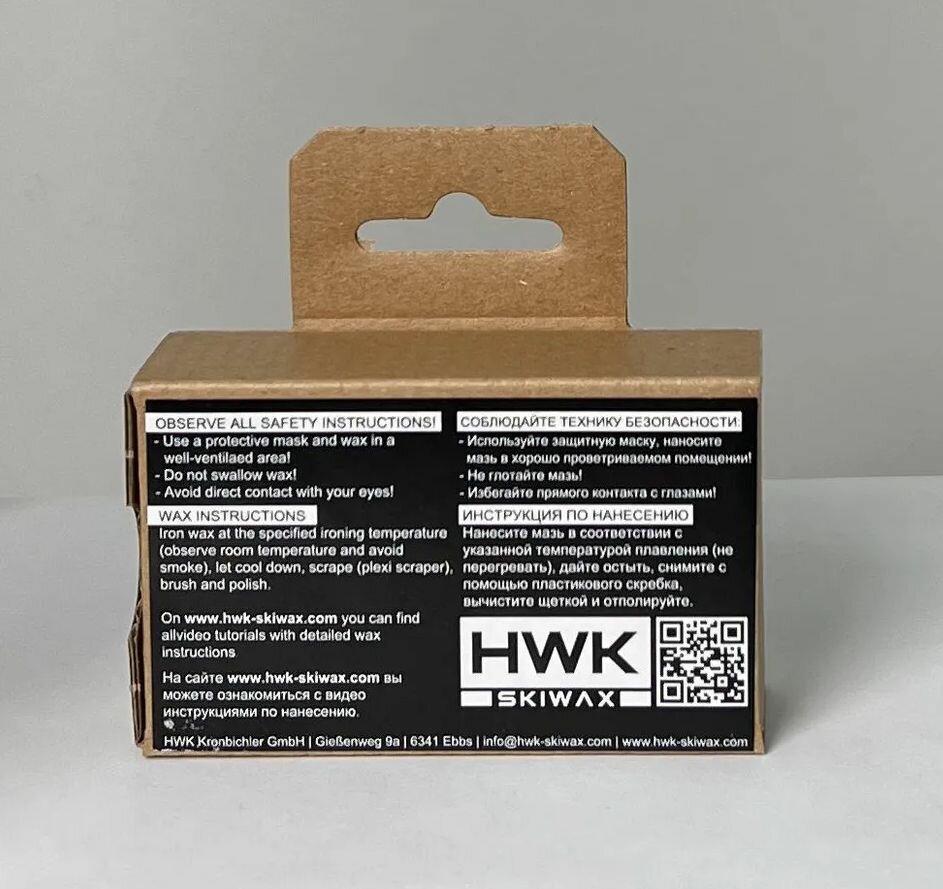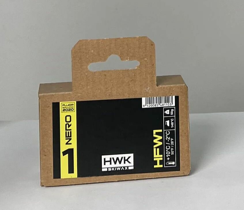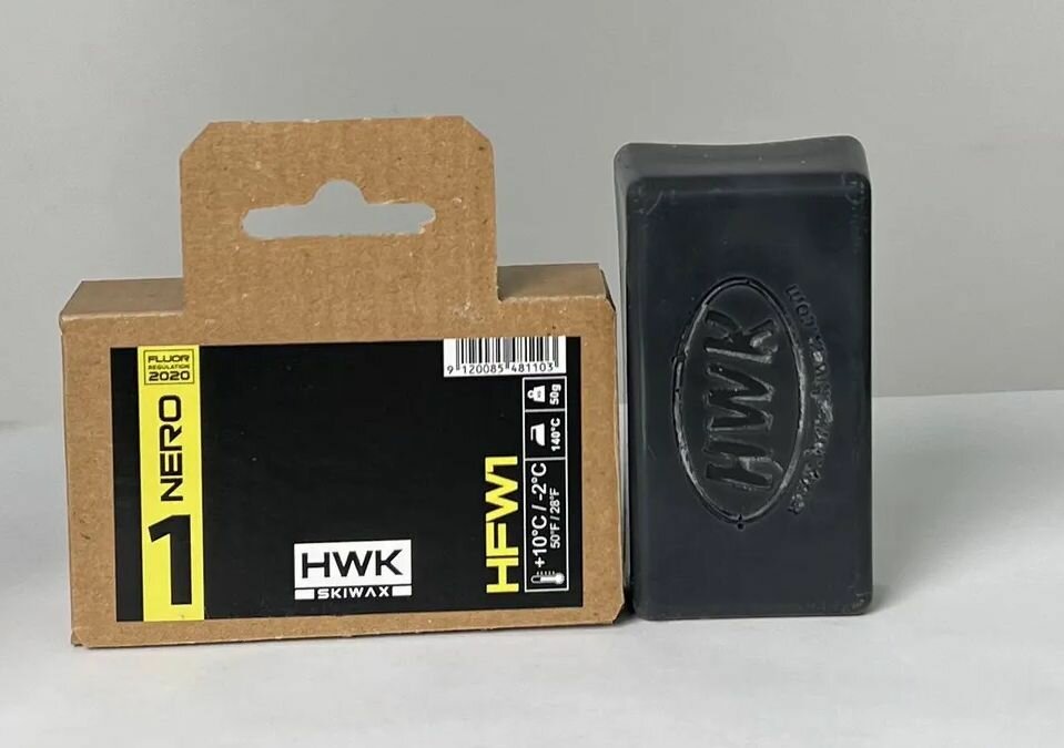 Высокофторовый парафин HWK HFW1. Имеет очень широкий спектр использования. Он рекомендован для крупнозернистого снега, искусственного снега, "мраморного" снега, влажного и мокрого снега. Отлично себя зарекомендовал в горных лыжах. Используется при относительной влажности воздуха >60%. Температура наплавления: 90°C