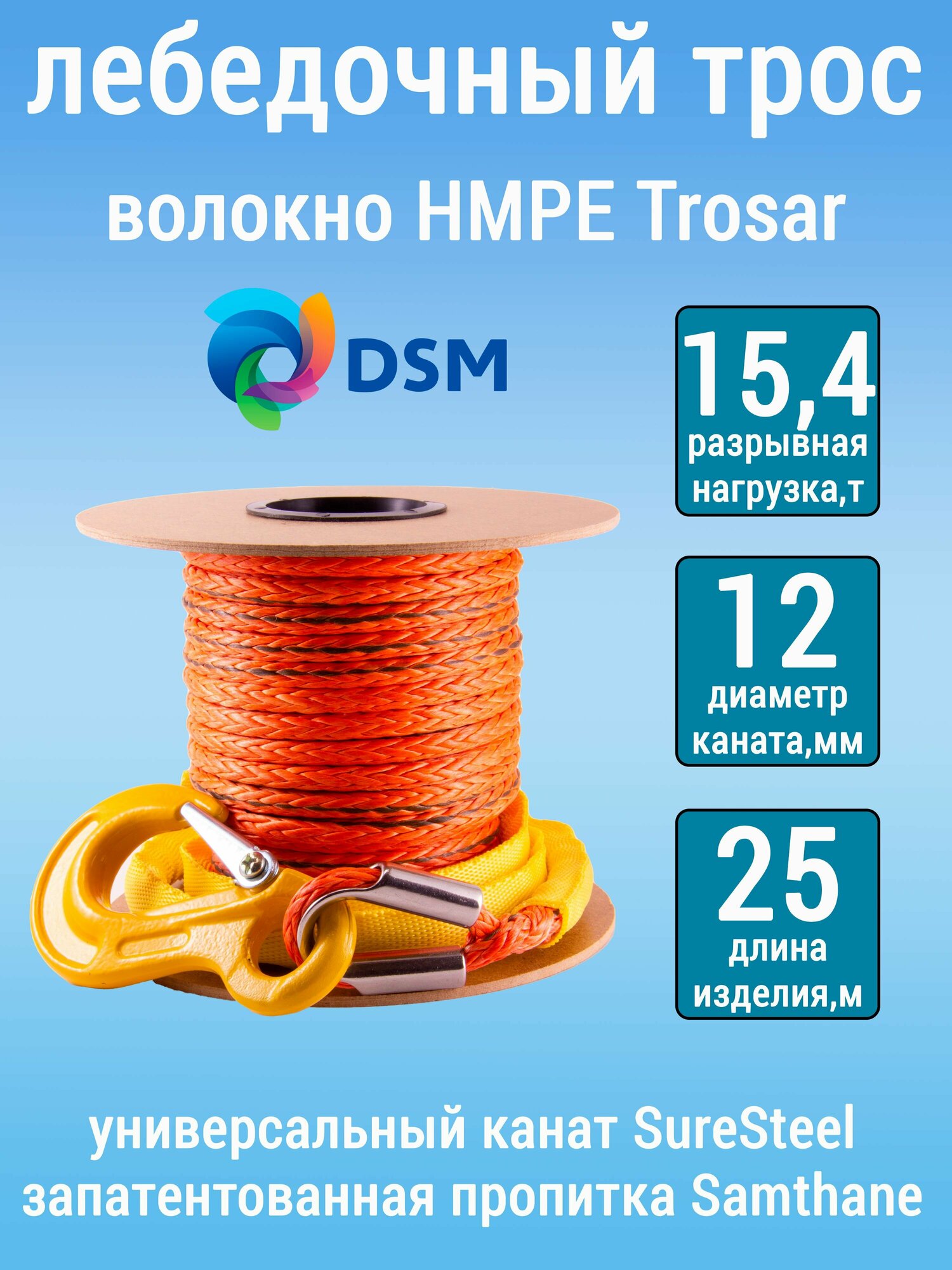 Высокопрочный синтетический канат UTX для лебедок, установленных на легковых, грузовых автомобилях и другой технике. Произведен из волокна HMPE Trosar 12мм компании DSM.