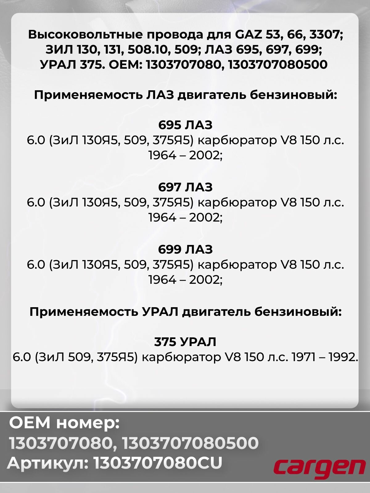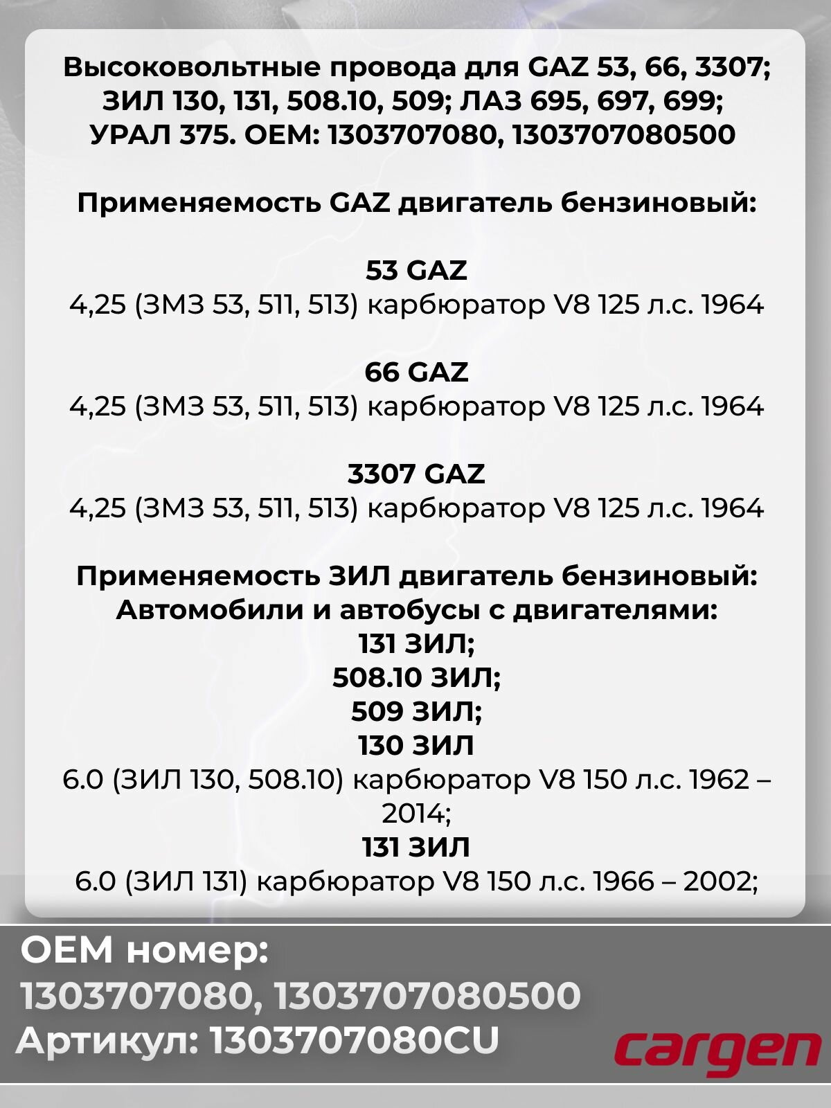 - Высоковольтные провода для GAZ 53 66 3307 / ЗИЛ 130 131 508.10 509 / ЛАЗ 695 697 699 / урал 375 OEM: 1303707080, 1303707080500 (комплект)