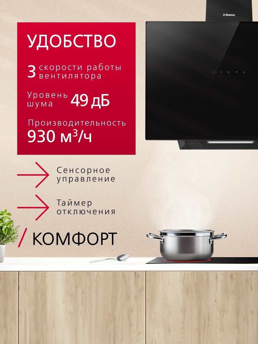 Наклонная вытяжка Hansa OKP653SBH, 60 см, сенсорное управление, 3 скорости, режимы отвода и рециркуляции, светодиодная подсветка, черная: сравнение цен, характеристики, фото, актуальное наличие и цены.