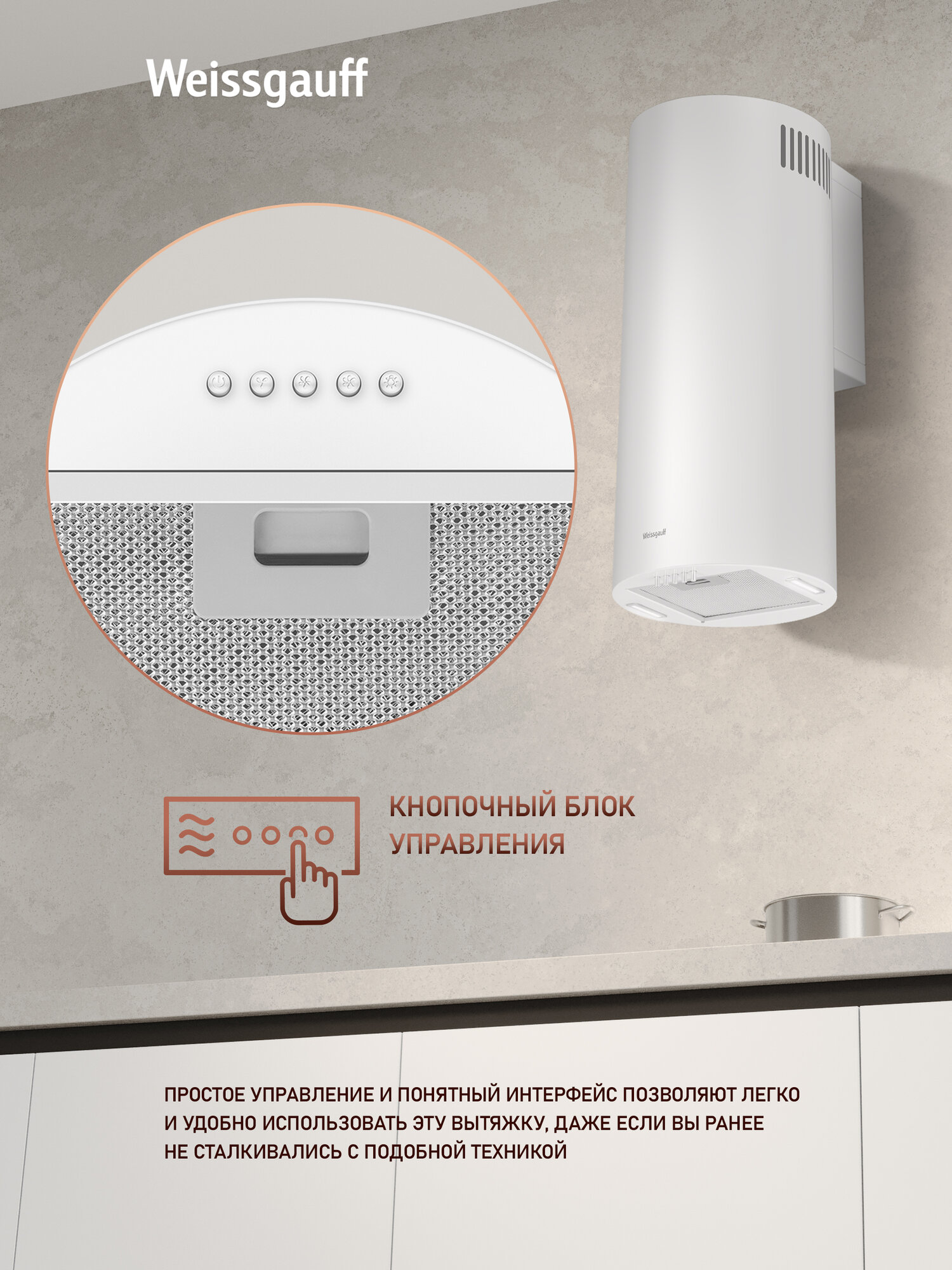Вытяжка цилиндрическая пристенная Weissgauff Tubus 700 PB WH, Алюминиевый жировой фильтр, Низкий уровень шума