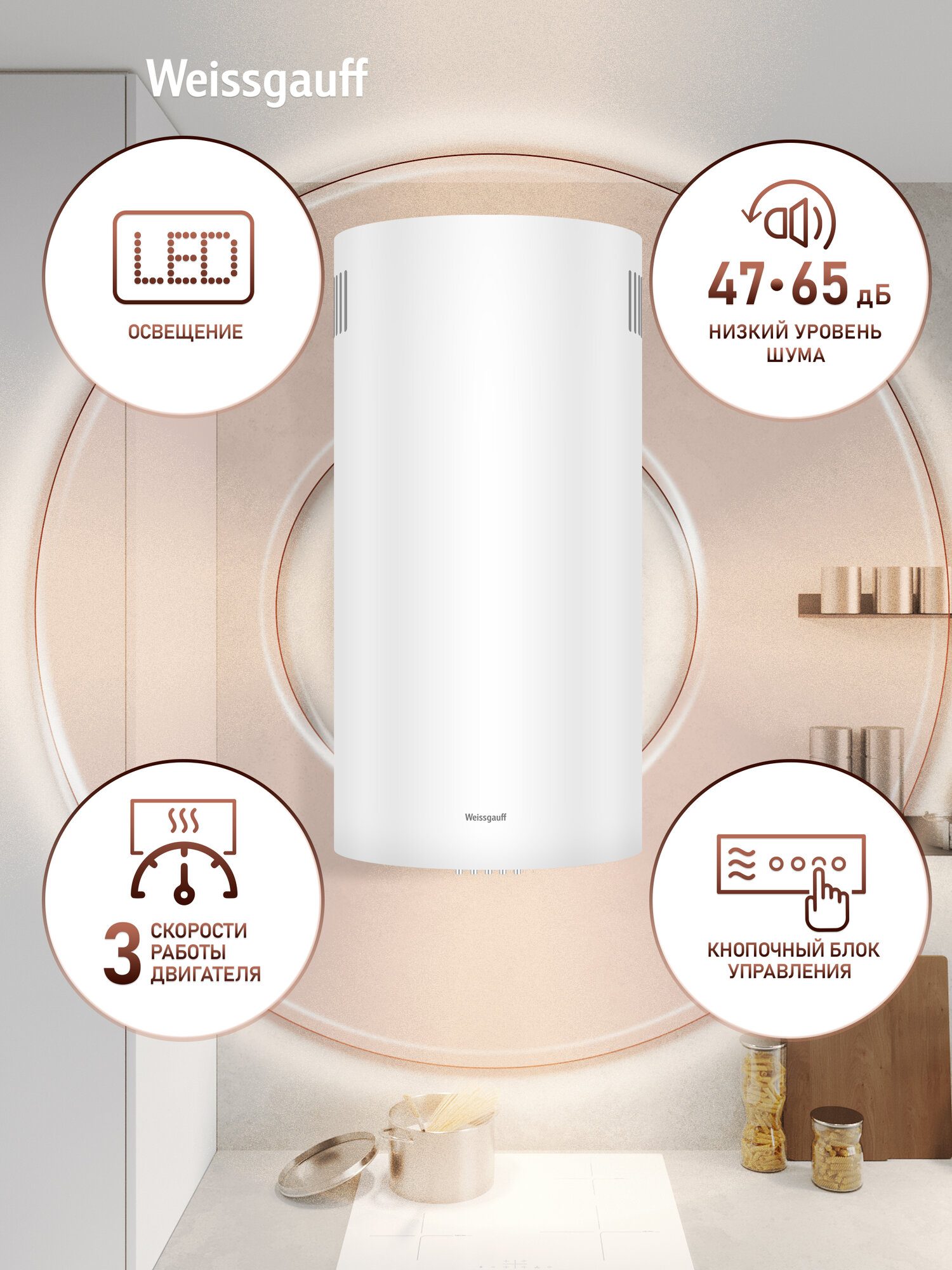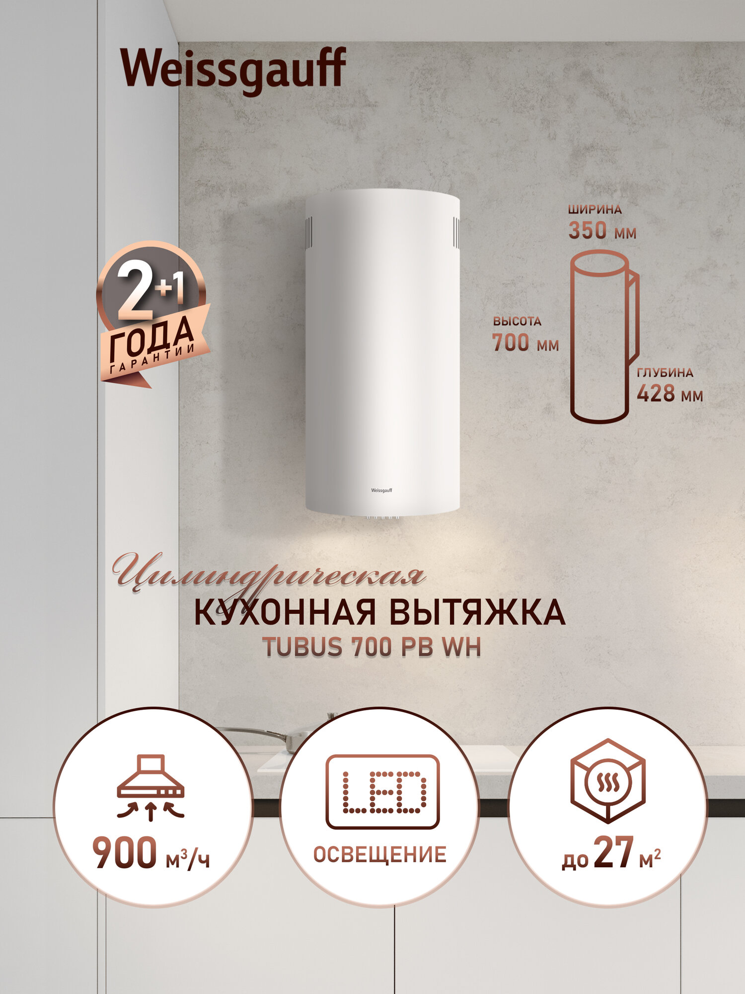 Купить Вытяжка цилиндрическая пристенная Weissgauff Tubus 700 PB WH, Алюминиевый жировой фильтр, Низкий уровень шума с доставкой по всей России.