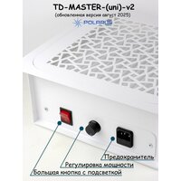 Вентилятор пылесоса изготовлен в КНР по лицензии Швейцарского производителя, он предназначен для промышленных вентиляционных систем поэтому имеет значительный срок службы в 40 000 часов (производитель указывает на то, что подшипники не требуют обязательного обслуживания в течении срока службы, а это более 5 лет). Благодаря точной балансировке вентилятора, он не создаёт лишнего шума и вибраций, что особенно актуально при проведении маникюра. Система фильтров дополнительно снижает уровень шума и в реальных условиях над столом уровень шума будет еще ниже.