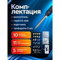 | Комплектация | -Выжигатель -10 шт. насадок для выжигания по дереву -11 шт. жала для выжигания -5 шт. трафаретные насадки - Горячий нож с держателем -2 шт. трафареты -Подставка |