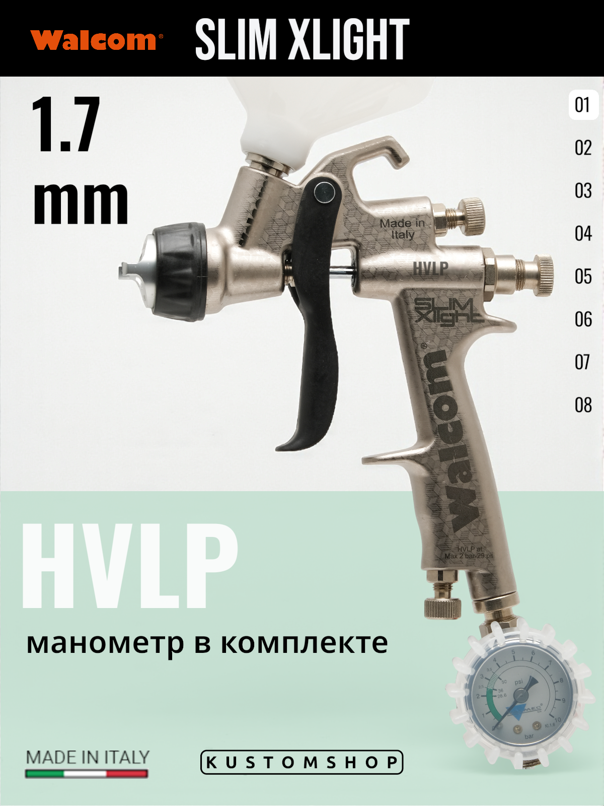 Ø сопла: 1,0 - 1,1 - 1,2 - 1,3 - 1,4 - 1,5 - 1,7 - 1,8 - 1,9 - 2,2 - 2,5 мм