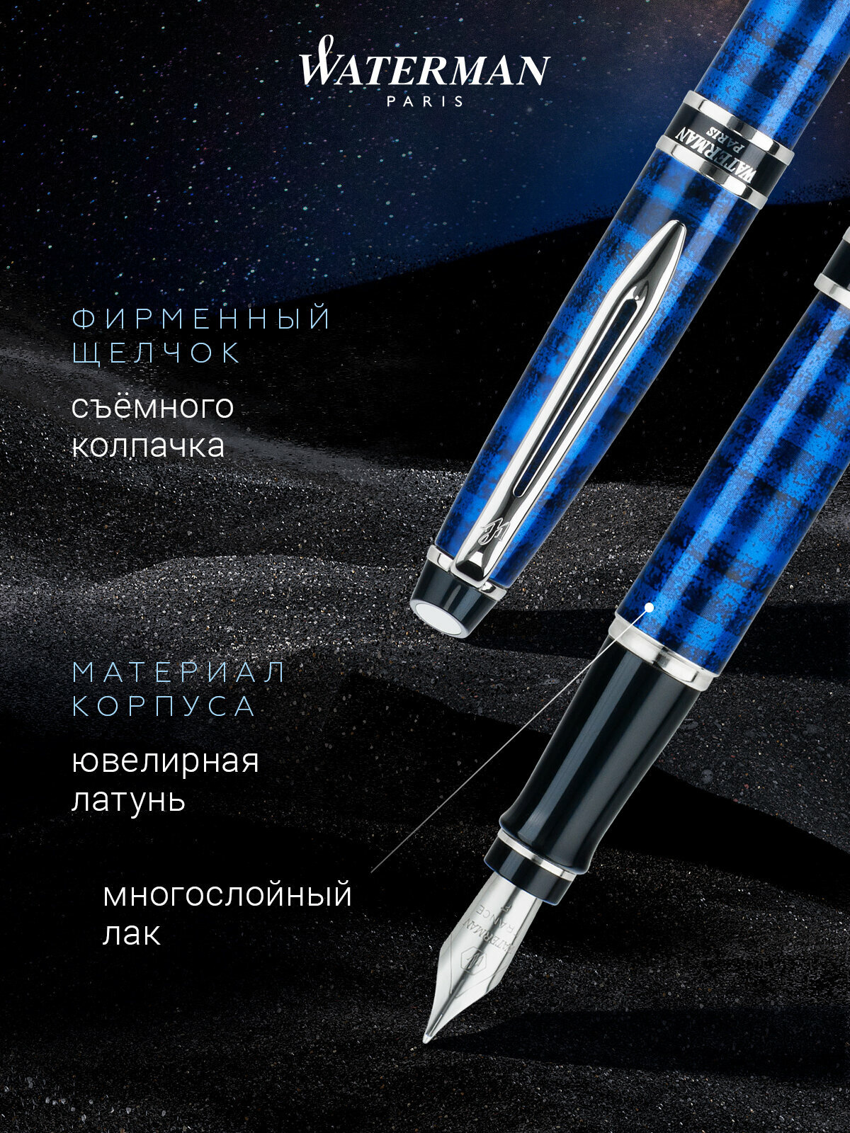 Перо : нержавеющая сталь. Отделка пера : оригинальная гравировка, нержавеющая сталь. Механизм : съемный колпачок. Корпус : ювелирная латунь. Отделка : высококачественный лак синего цвета с рисунком в стиле "Dune", широкое кольцо на колпачке украшено черной лаковой полоской и имеет надпись "Waterman Paris", отдельные элементы дизайна - никеле-палладиевое покрытие. Размеры ручки : длина - 138 мм, максимальная ширина (диаметр) - 13,3 мм. Вес ручки : 34 гр. Цвет : лаковый синий / серебристый. Обладая крупным утолщенным корпусом, идеально подходящим для мужской руки, также скошенным торцом корпуса и надежным пером из нержавеющей стали, Expert совмещает в себе одновременно оригинальность и стиль. Ультрасовременные модели с матовыми и глянцевыми, либо сатиновыми хромированными отделками дополняются утонченными лакированными моделями, украшенными нежным рисунком в стиле 'Dune'. Expert. Точность. Требовательность. Эффективность.